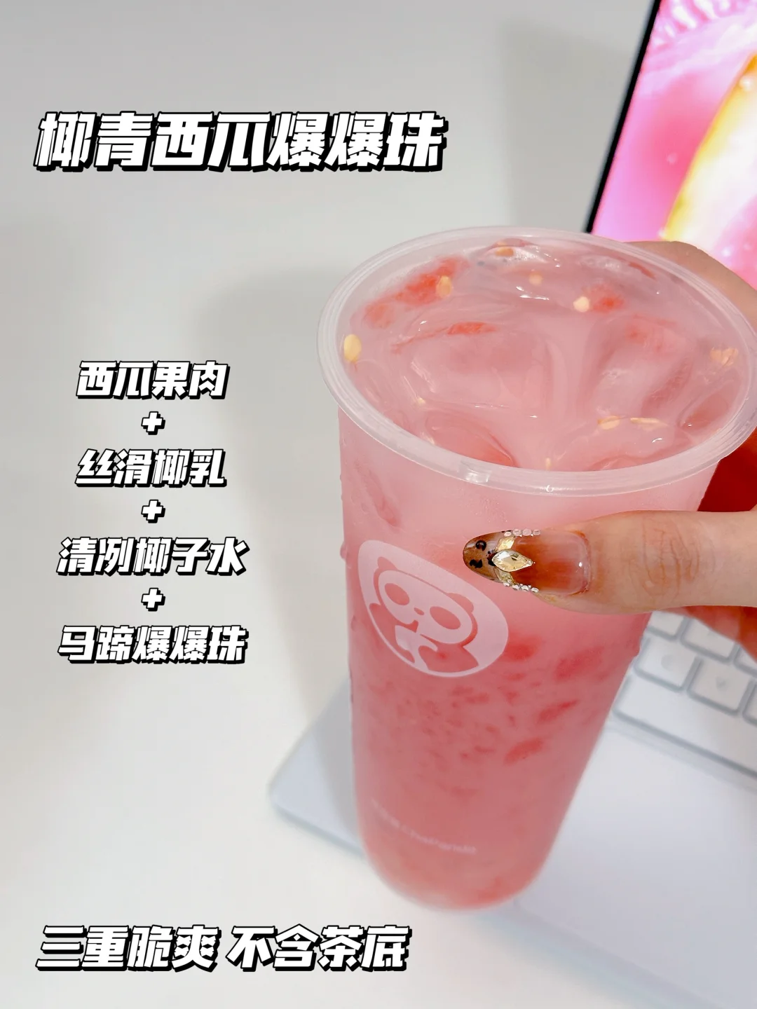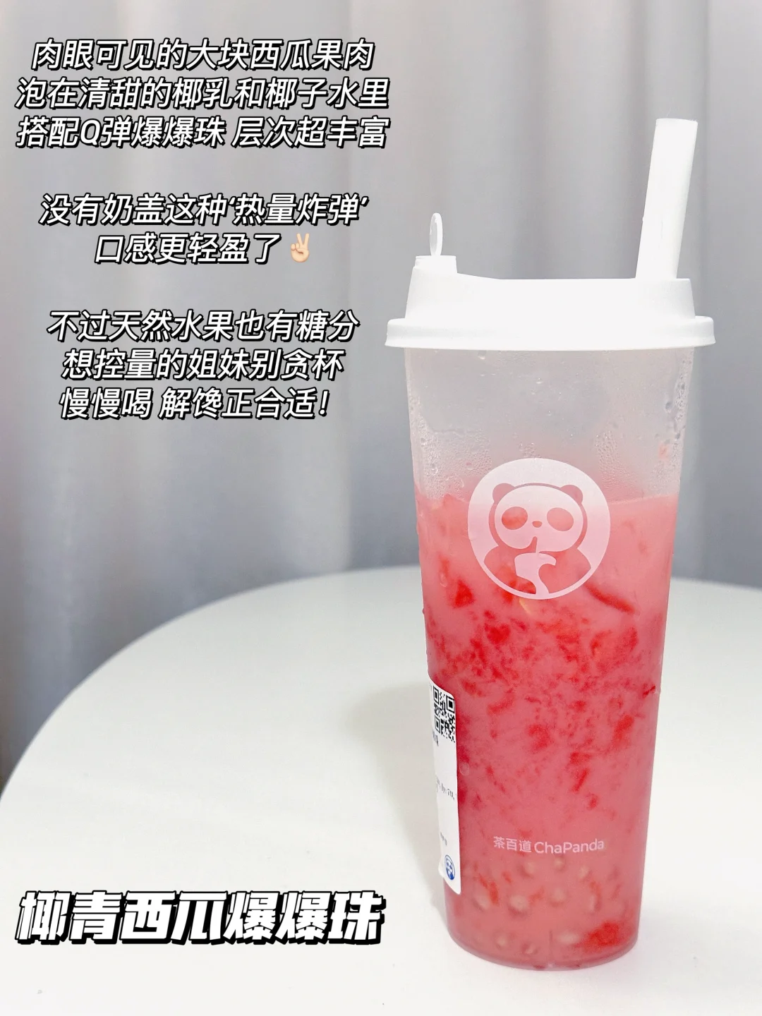 肉眼可见的大块西瓜果肉,泡在清甜的椰乳和椰子水里,搭配Q弹爆爆珠 ,层次超丰富! 没有奶盖这种‘热量炸弹’,口感更轻盈了✌🏻