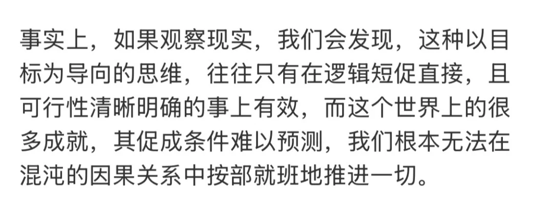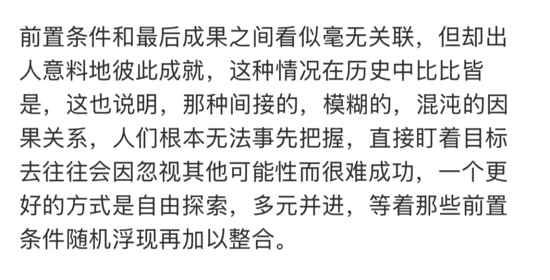 生活中的伟大目标往往无法被计划,因为因果关系是混沌的,只朝着目标去,有可能会被困进一个接近目标的死路