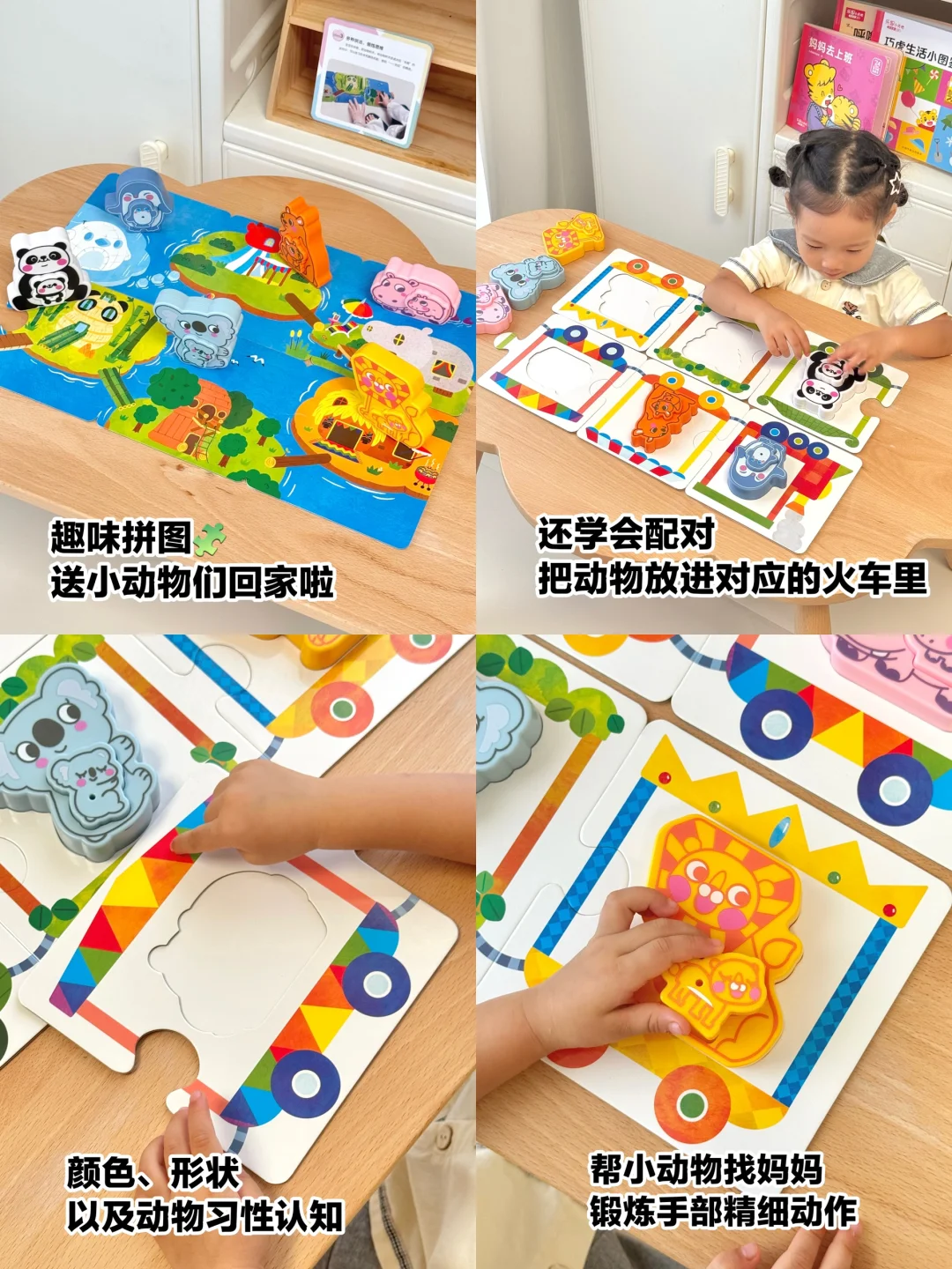 有很多种玩法,帮动物宝宝们找妈妈,正反两面火车、动物岛拼图