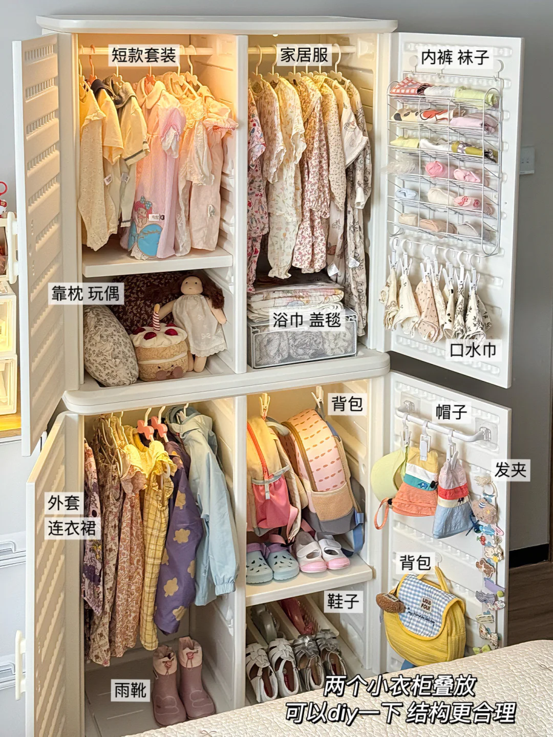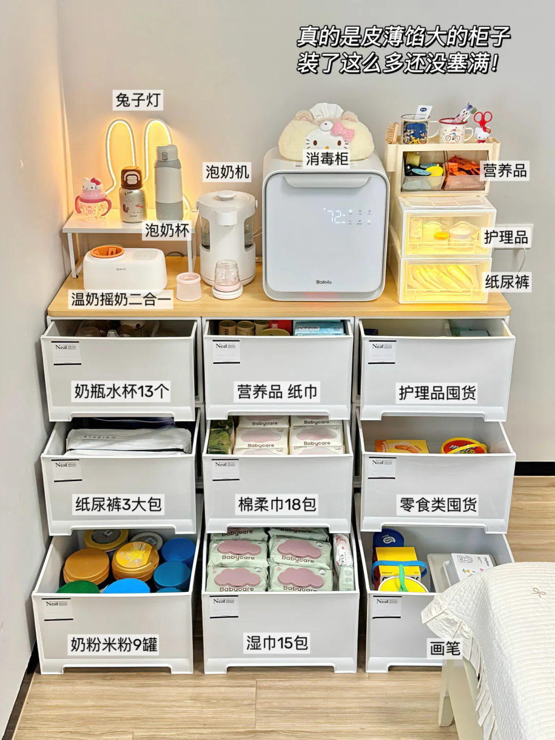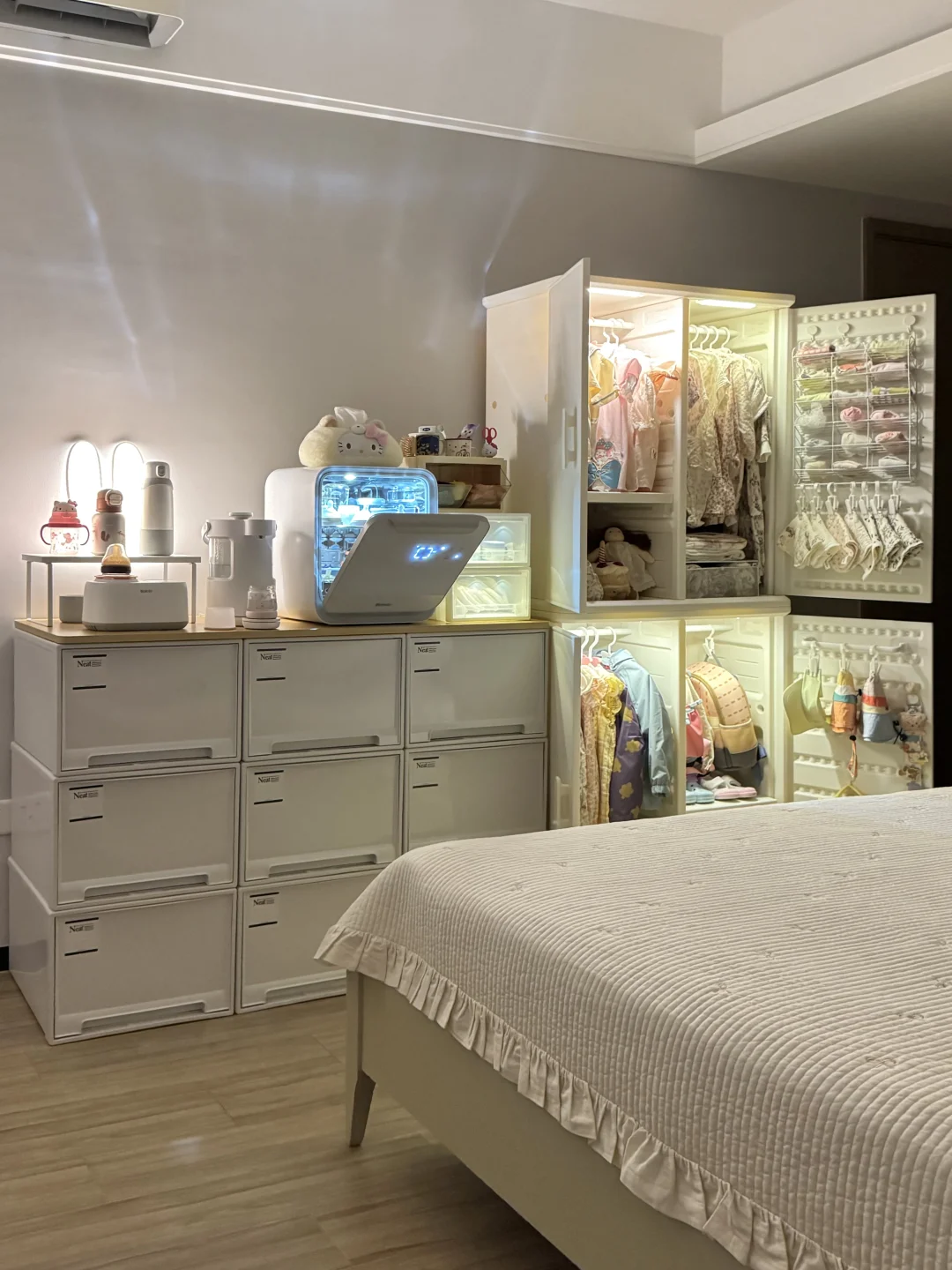 之前宝宝各种东西都是放在床头柜上,衣服放在大人衣柜,地方完全不够用。