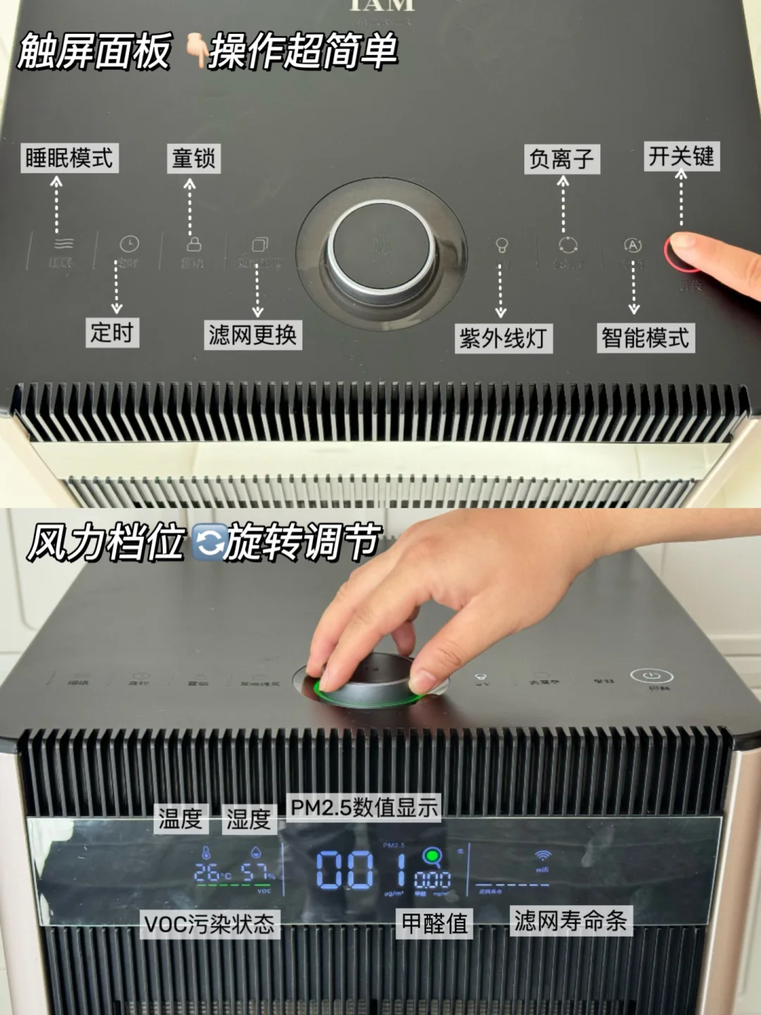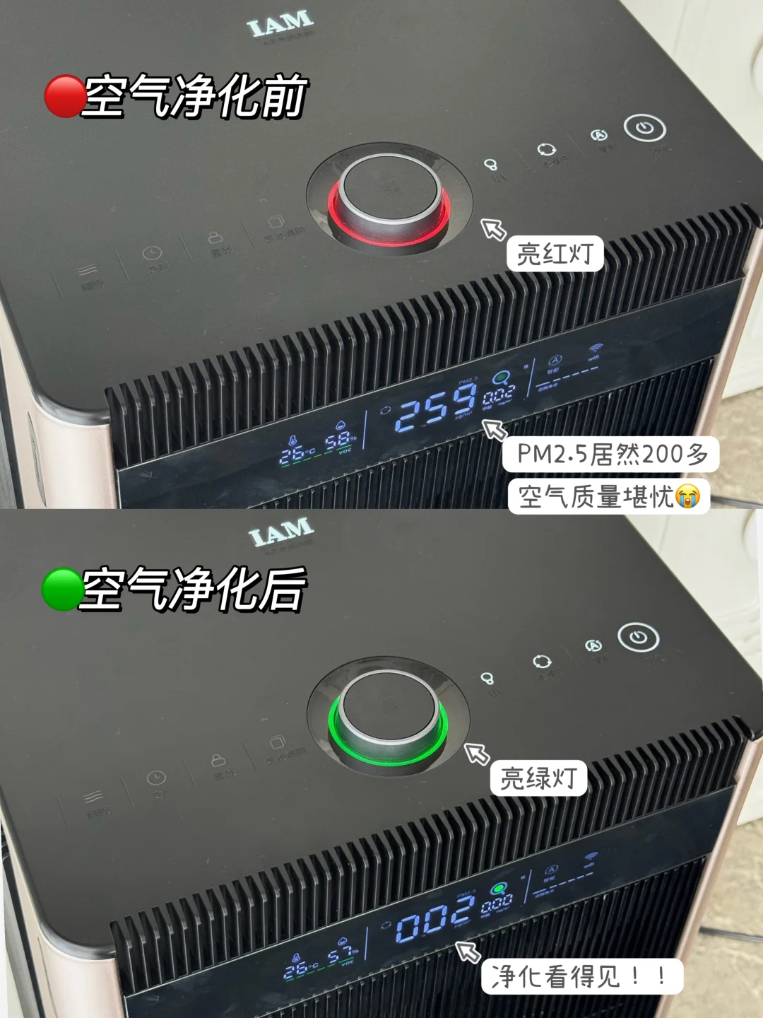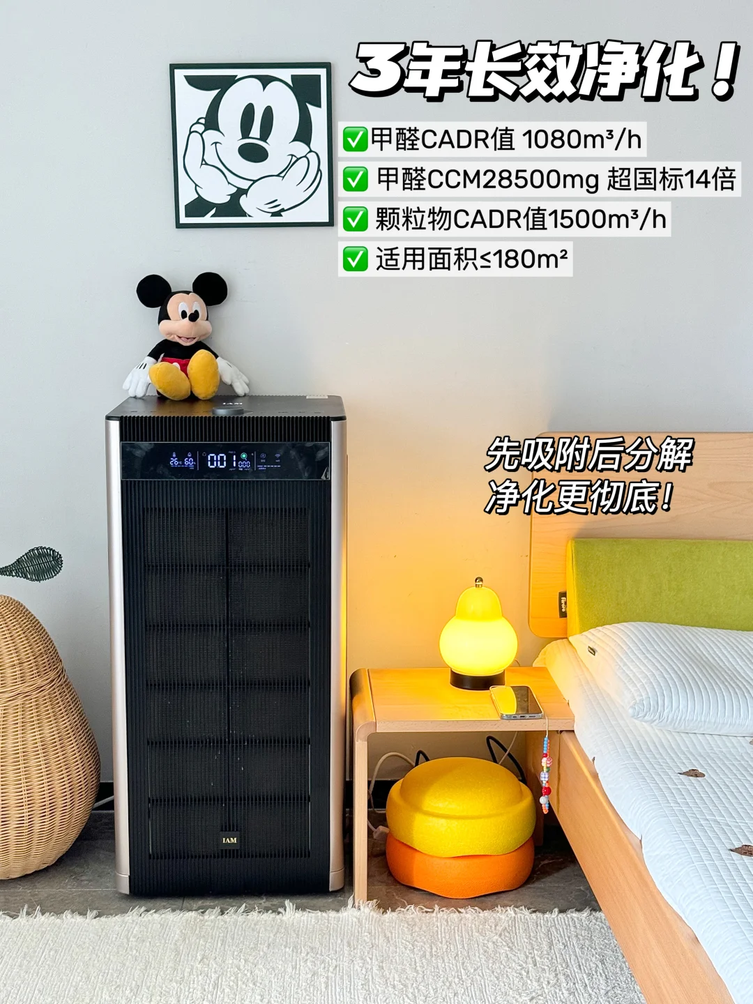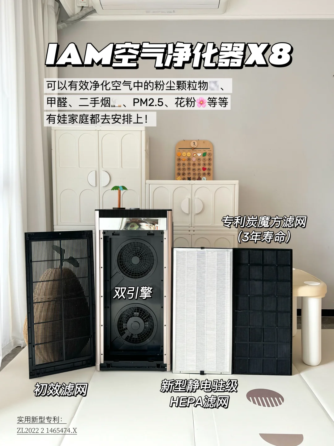 举家搬来了三亚🏝 结果年前搬了新家🏠 开发商说是精装 但用料是真的不咋样…… 加上我家还有娃👶🏻有狗🐶有老人 权衡利弊还是入手了一台空气净化器 目前用了2个月,分享下使用感受 · 我选的这台是 IAM空气净化器X8 用下来整体比较满意👍 买前队友研究了几天,这台核心参数很出众 先解释一下,CADR值代表空气净化器的净化速度,CCM值代表滤网的累积净化量 要知道!CADR值会随着CCM值的消耗不断衰减的! 到一定程度之后,就没有办法保证净化能力 所以想要长期除醛,一定得看CCM值 CCM值越高,净化有效性就越持久,滤网寿命就越长! 我入的这款甲醛CCM值 28500mg ,远超国标14倍 能做到三年长效净化除醛 甲醛CARD值1080 m³/h,颗粒物CARD值 1500 m³/h 属于市面上空气浄化器里很🐮的存在了! 第一次用的时候,差不多半小时数值就降下来变绿灯了(我家套内110 m²) PM2.5数值也是肉眼可见的下降⬇️ 空气净化器的核心配件就是👉🏻滤网! 他家是专利炭魔方滤网,可以直接使用三年不用换! (实用新型专利:ZL 202221465474.×) 我拆开看了是一块一块的超厚炭魔方 下重本!上称整整将近10斤重! 它可以做到吸附后,把甲醛分解成水和二氧化碳 不用担心甲醛二次挥发污染空气 双风道搭配双引擎,净化力拉满📈 除了初级滤网,双侧都有新型静电驻HEPA滤网 粉尘、细🦠、细小的颗粒物全部一网打尽! 再加上8重Uv紫外灯💡多种过敏原和🦠统统远离! 用上明显感觉家里空气清新不少! 平时我放在客厅,我娃👃🏻敏,阿嚏阿嚏都减少了耶! 还可以推到刚装好新床的儿童房, 晚上关着门窗,净化器开睡眠模式💤 第二天早上真的没有啥味道!睡眠模式是熄屏且很静音🔇不会打扰宝宝睡眠 · 平时用app来操控,看实时数据,巨方便 现在家里每天都是绿灯💚状态,新房住起来很安心 有娃有宠、空气质量差、喜欢宅家的🏡 建议家里放一台空气净化器,这台非常ok~ 现在🐶东买还有国补!现在入手超划算!!真的是闭眼冲