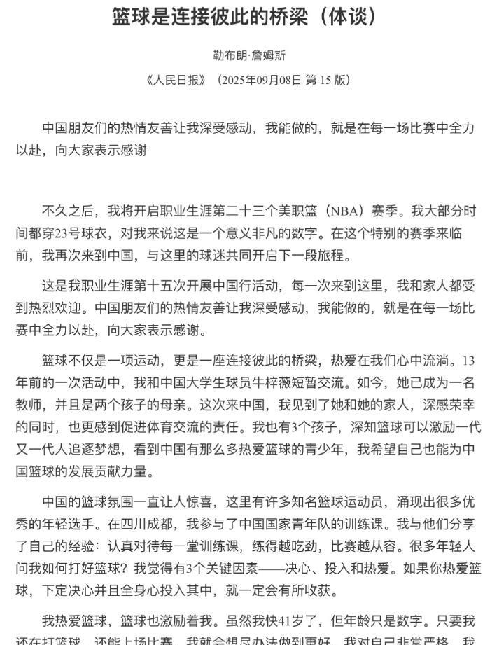 勒布朗-詹姆斯再次登上《人民日报》,篮球是连接彼此的桥梁(2025年9月8日 第15版)。 中国朋友们的热情友善让我深受感动,我能做的,就是在每一场比赛中全力以赴,向大家表示感谢。 不久之后,我将开启职业生涯第二十三个美职篮(NBA)赛季。我大部分时间都穿23号球衣,对我来说这是一个意义非凡的数字。在这个特别的赛季来临前,我再次来到中国,与这里的球迷共同开启下一段旅程。 这是我职业生涯第十五次开展中国行活动,每一次来到这里,我和家人都受到热烈欢迎。中国朋友们的热情友善让我深受感动,我能做的,就是在每一场比赛中全力以赴,向大家表示感谢。 篮球不仅是一项运动,更是一座连接彼此的桥梁,热爱在我们心中流淌。13年前的一次活动中,我和中国大学生球员牛梓薇短暂交流。如今,她已成为一名教师,并且是两个孩子的母亲。这次来中国,我见到了她和她的家人,深感荣幸的同时,也更感到促进体育交流的责任。我也有3个孩子,深知篮球可以激励一代又一代人追逐梦想,看到中国有那么多热爱篮球的青少年,我希望自己也能为中国篮球的发展贡献力量。 中国的篮球氛围一直让人惊喜,这里有许多知名篮球运动员,涌现出很多优秀的年轻选手。在四川成都,我参与了中国国家青年队的训练课。我与他们分享了自己的经验:认真对待每一堂训练课,练得越吃劲,比赛越从容。很多年轻人问我如何打好篮球?我觉得有3个关键因素—决心、投入和热爱。如果你热爱篮球,下定决心并且全身心投入其中,就一定会有所收获。 我热爱篮球,篮球也激励着我。虽然我快41岁了,但年龄只是数字。只要我还在打篮球,还能上场比赛,我就会想尽办法做到更好。我对自己非常严格,我希望不断创造新成就,努力成为最好的球员。 (作者为美职篮洛杉矶湖人队队员,本报记者王亮采访整理)