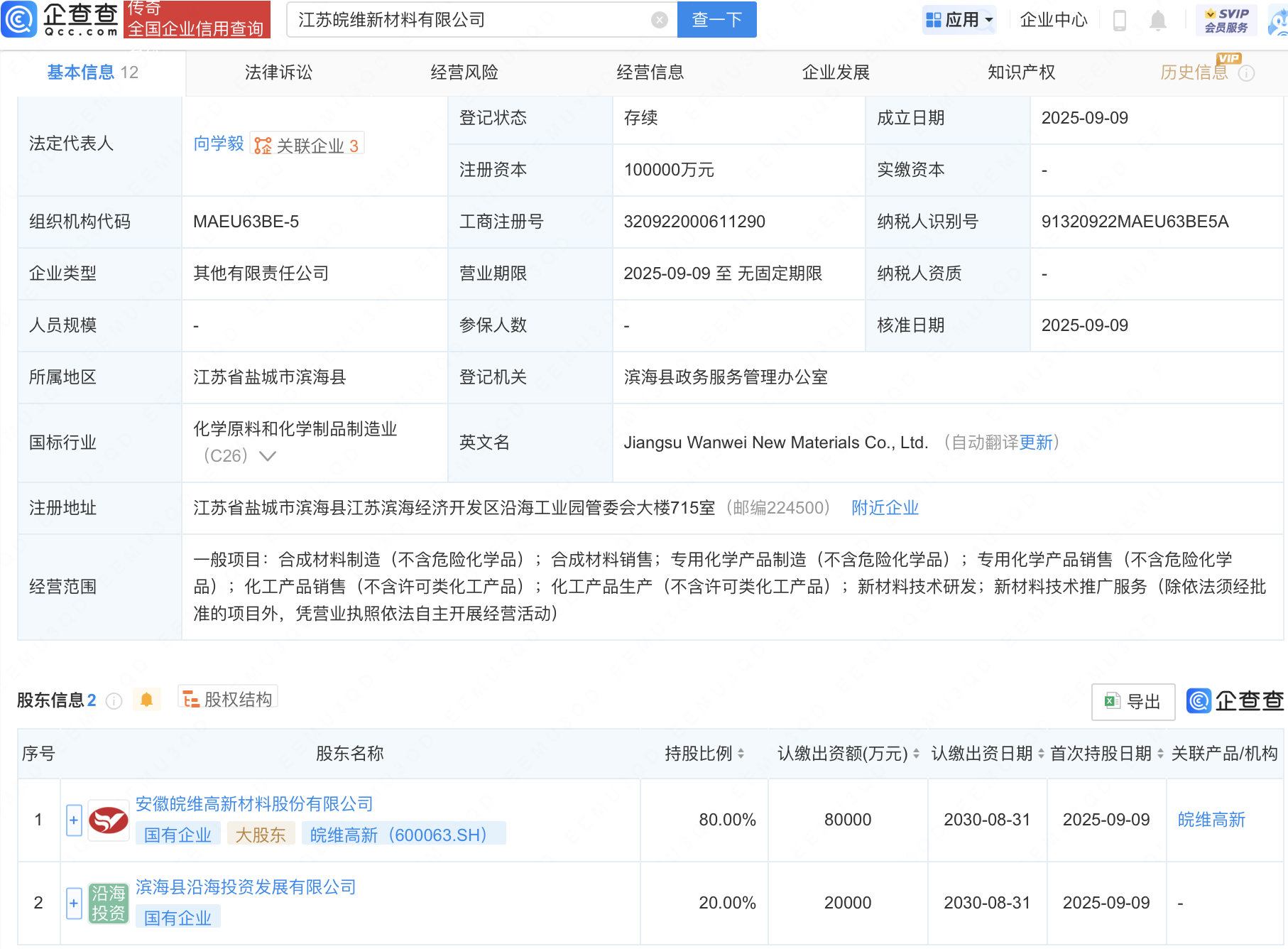 企查查APP显示,近日,江苏皖维新材料有限公司成立,注册资本10亿元,经营范围包含:新材料技术研发;新材料技术推广服务等。企查查股权穿透显示,该公司由皖维高新(600063)等共同持股。