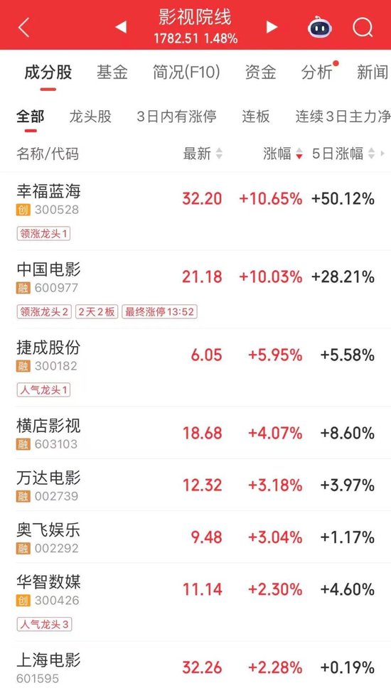 今天下午,影视股再度活跃,中国电影涨停,幸福蓝海涨超10%。
