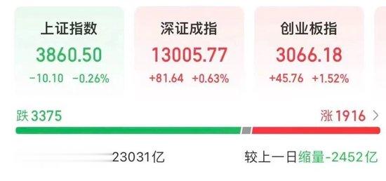 截至收盘,上证指数下跌0.26%,深证成指上涨0.63%,创业板指上涨1.52%。市场全天成交额为23031亿元,较上日缩量2452亿元。