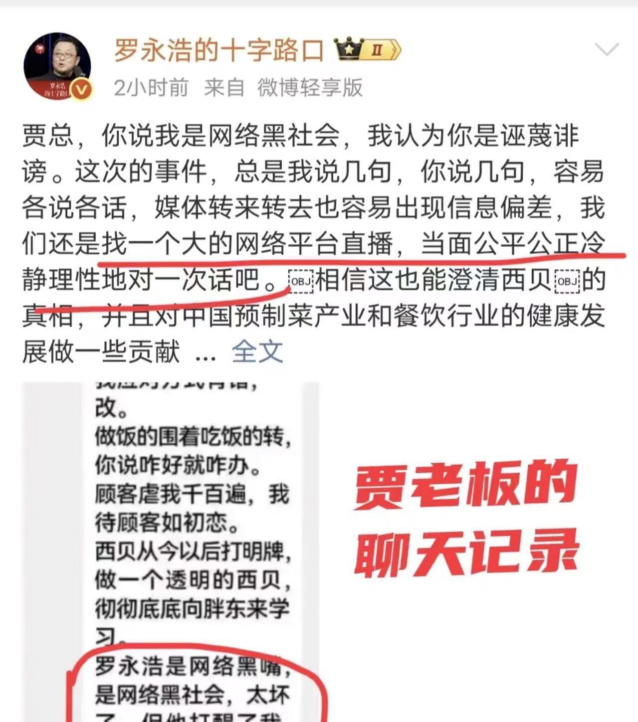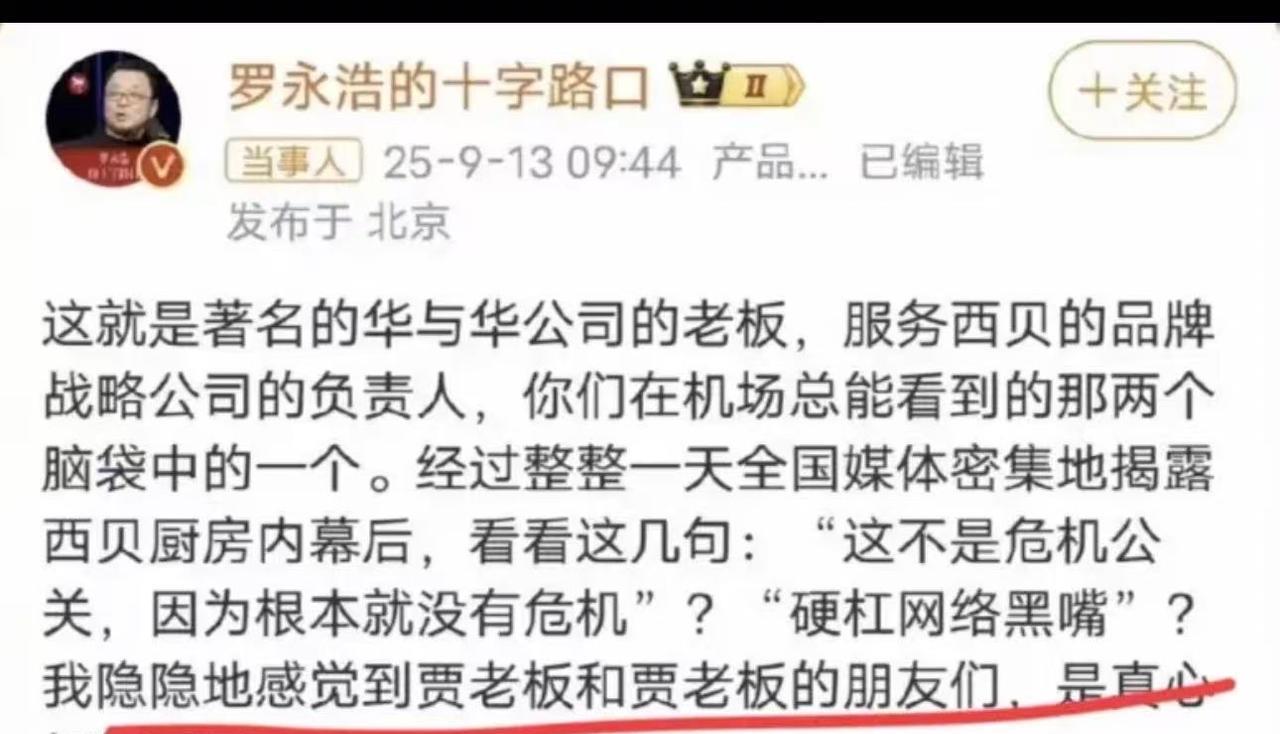 其实,“毁掉”西贝的不是老罗,而是西贝董事长贾国龙! 老罗和贾国龙约好“比武”,结果老罗一招还没出去,贾国龙就使出一招“自投罗网”宣布对外开放后厨。 本以为贾国龙做好万全俱备,可以自证清白,结果万万没想到,迎来史诗级公关危机。 主打的儿童餐,西兰花保质期2年,现熬鸡汤是调制的,网友吐槽说:“本来想着贵一点的东西会好点,给孩子吃健康一点,没想到吃的西兰花,比我孩子的岁数还要大!” 更无语的是,厨师都不把记者当外人,冰箱里的羊腿拿出来,过几天就满一周年祭日了,还硬说这样的市场更新鲜健康,因为采用速冻技术。 还有厨房下水道堵了,厨师用烧菜的漏勺直接去捞,厨房里的油用的是转基因的大豆,最可笑的是,厨师烧菜做饭的时候,还带着手表首饰,这哪有一点厨师的样子? 还有网友总结的笑料,更是数不胜数: 1、羊:为什么我还不能投胎?阎王爷:你还有一条腿在西贝冻着 2、西贝:菜都是预制的,只有客人是现宰的! 3、妈妈懒得做饭,带孩子去西贝,没想到西贝也懒得做。 4、老贾在自证与自救之间选择了自杀。西贝员工在自证与自救之间选着了自首。 5、我表妹在西贝干厨师,她权力挺大的,管九个微波炉,简称九炉总管 6、老罗:“算了。” 西贝老板:“凭什么你说算了就算了。”接着又给了自己一刀 其实老罗说的很清楚,他不反对预制菜,只是反对消费者没有知情权。我如果花了人均一两百元一顿,你给我吃过夜过年的食材,那就说不过去了。 如果告诉消费者,羊腿冻了一年,西兰花快2年了,他们会花高价去买单吗? 一个冻的馒头蒸一下就卖21块,这个事情不管中国企业外国企业都干不出来! 更让人想不明白的是,罗永浩都说西贝的事情到此为此了,可贾国龙还是在群里说“罗永浩是网络黑嘴,是网络黑社会,太坏了”! 这下真的把老罗惹急眼了,他正式向西贝宣战,说这件事情没有办法过去,谁劝和拉黑谁! 回顾老罗的战斗史,唯一败绩就是“中杯,大杯,超大杯!” 这次绝对是给足了克制和面子,可惜贾国龙迷之自信!这真是自己不想活,步步精准的走在最差的点上! 主要是贾国龙背后的咨询公司怂恿西贝继续和罗永浩斗争,甚至不少餐饮行业老板,甚至连于东来也力挺西贝,让贾国龙飘了,认为可以和罗永浩、网友斗争下去。 还有人说,西贝倒了1.8万人没工作了,感情为了1.8万人,所有人都要去西贝吃2岁的西兰花?冻鱼冻肉? 在我看来,这反而是好事情,倒闭餐馆用新鲜食材做饭,做透明厨房,让老百姓吃上真正有烟火气的饭菜! 一贝倒,万物生,西贝没了,自然有东贝!消费在,市场在,就业就不会少! 现在这事情不能轻易收场了,已经上升到具备历史性的意义了,极大可能会推动预制菜的行业标准、标识,以及使用场景透明化等相关系统性的变革! 只能说贾国龙真的玩不转互联网,一个食客,吃了一顿难吃又贵的饭,吐个槽而已,居然要叫板起诉! 要找回场子没毛病,但关键先找回脑子,这老罗都还没发力,贾总上来就先放葵花宝典了…… 葵花宝典都放了,老罗都心生怜悯了,转身刚要走,好家伙,贾总又来个切腹!我反正是服了!