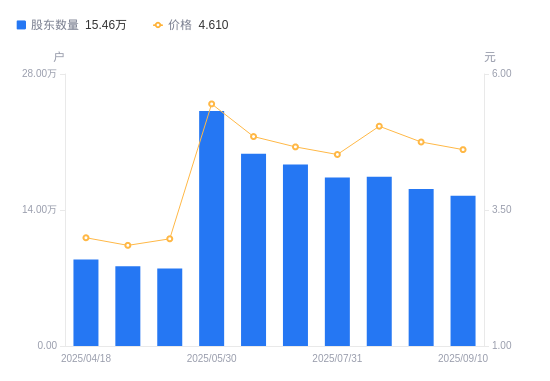 近一年(2024年9月20日至2025年9月10日),中超控股A股股东户数从8.27万户,增加至15.46万户,增幅87.05%,区间股价上涨134.01%。