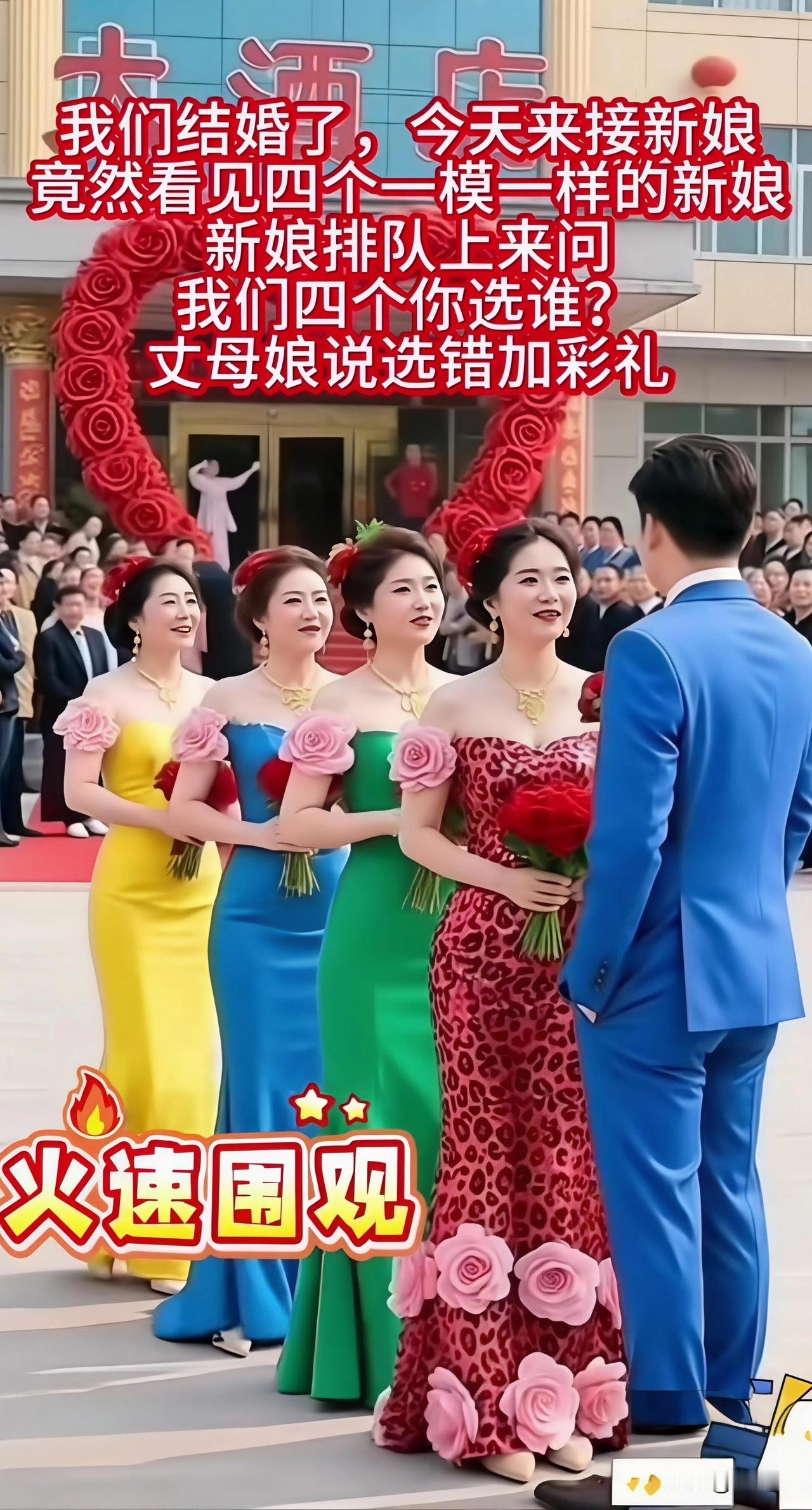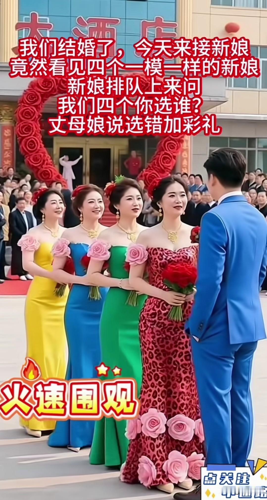 小伙子“得罪”了丈母娘,上门迎亲时遭遇难题。丈母娘临时使出“阴招”,让四胞胎女儿梳妆打扮一同现身,宣称新郎若选错新娘,需额外增加二十万彩礼。 四姐妹不仅容貌别无二致,连穿着款式也如出一辙,仅颜色有所差异。这可把新郎给整懵了,他一不小心选错,不但没能接走新娘,还得再拿出二十万。 一旁围观的人笑得前仰后合,有人打趣道,要不把四个全带走,倒也省事。 更有网友给出主意:“傻小子,拿出结婚证对照照片,对上的那个就是新娘。”