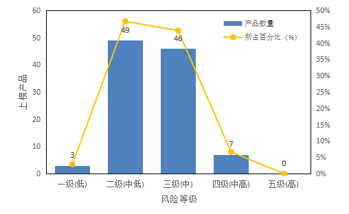 权益市场持续回暖,上榜产品的整体风险水平略有上升。上榜产品中风险等级为三级(中风险)及以上的产品占比达50.47%,四级(中高)风险的产品占比达6.67%。