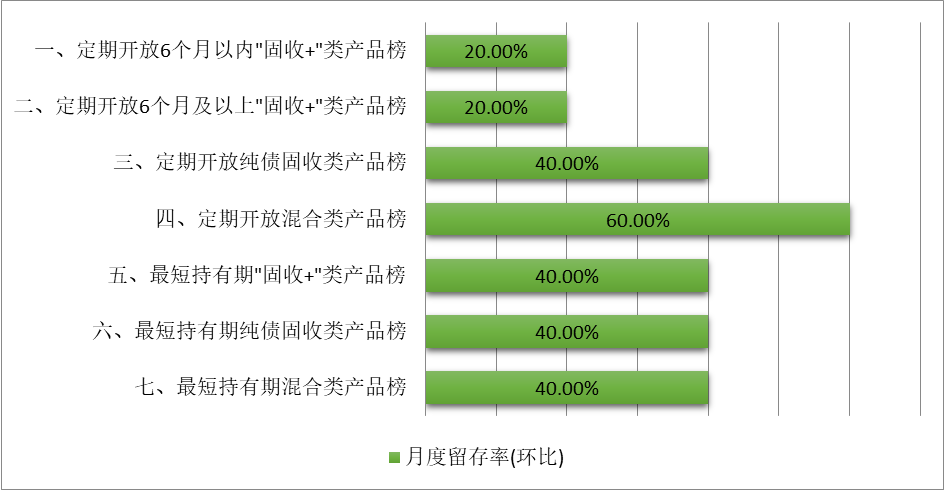 7个榜单的105只理财产品,来自33家银行理财管理机构。从榜单留存率来看,共有22家机构旗下39只产品连续上榜,留存率为37.14%,较7月份榜单明显上升。但定期开放“固收+”类产品留存率相对较低,说明市场竞争激烈。