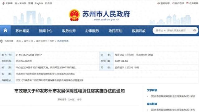 近日,从苏州市政府官网获悉,《苏州市发展保障性租赁住房实施办法》(以下简称《办法》)正式发布。《办法》自2025年10月9日起实施,有效期至2030年10月8日。
