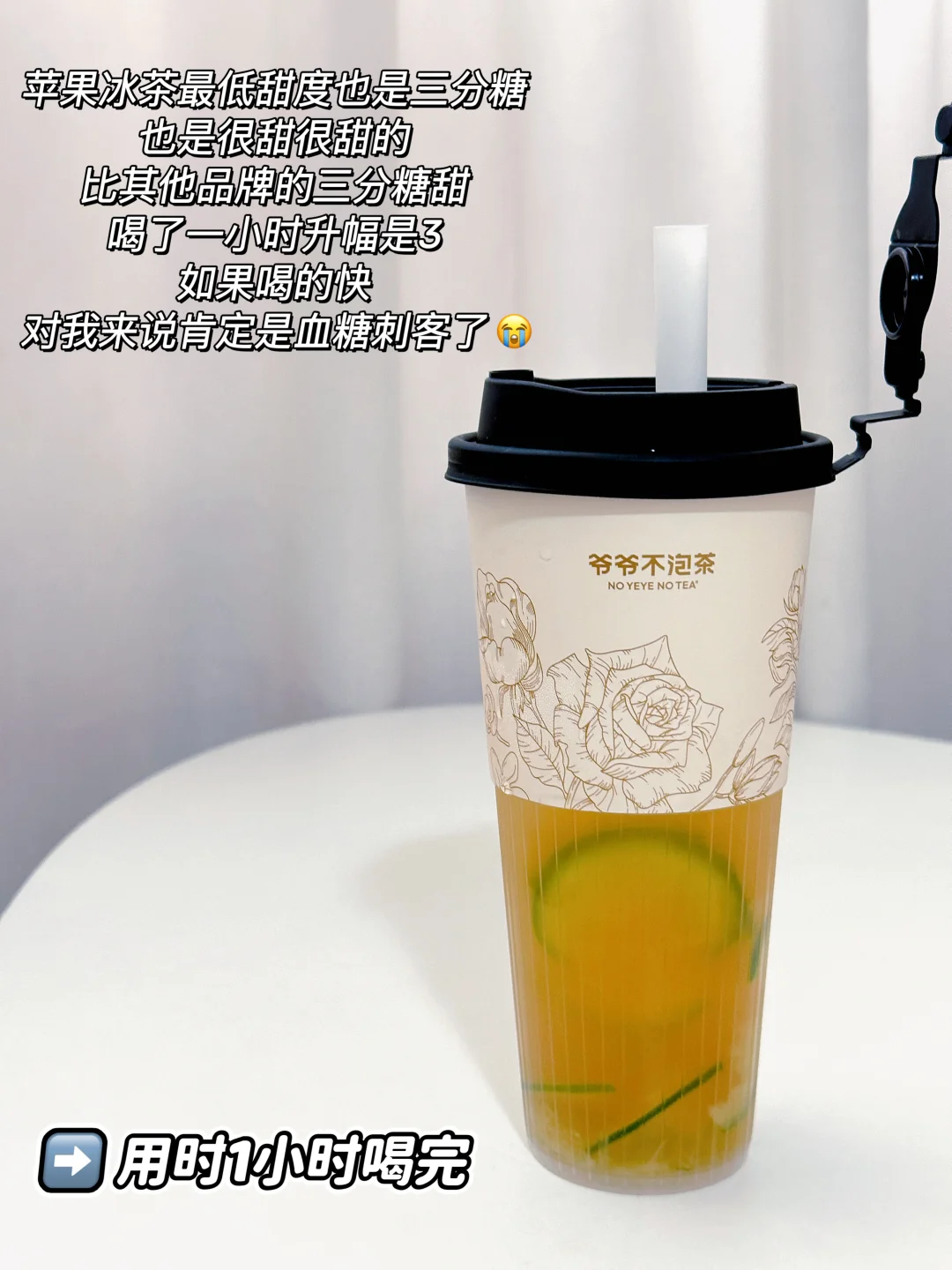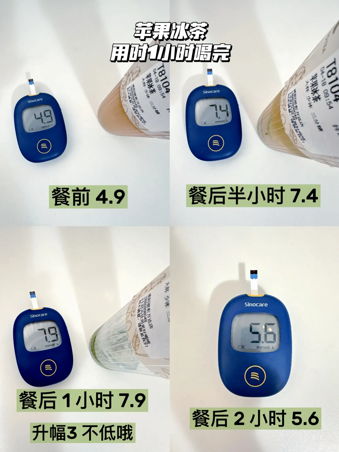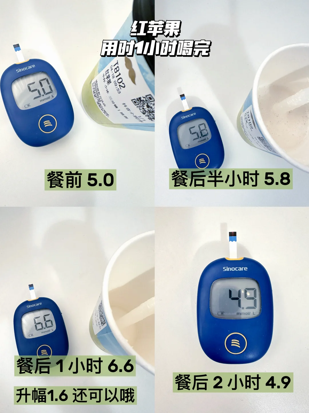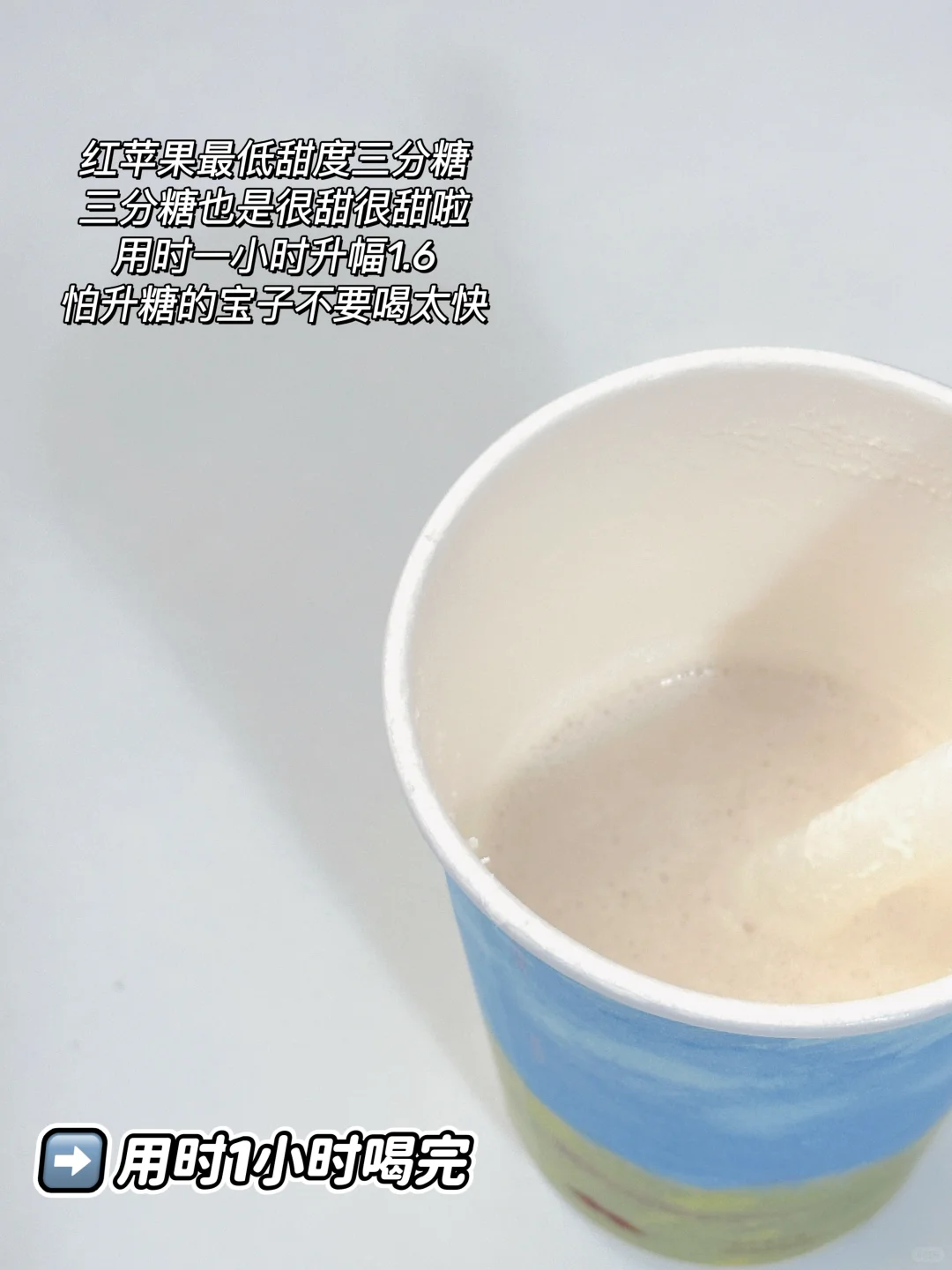 红苹果最低甜度三分糖,三分糖也是很甜很甜啦〰️用时一小时升幅1.6,怕升糖的宝子不要喝太快哈〰️
