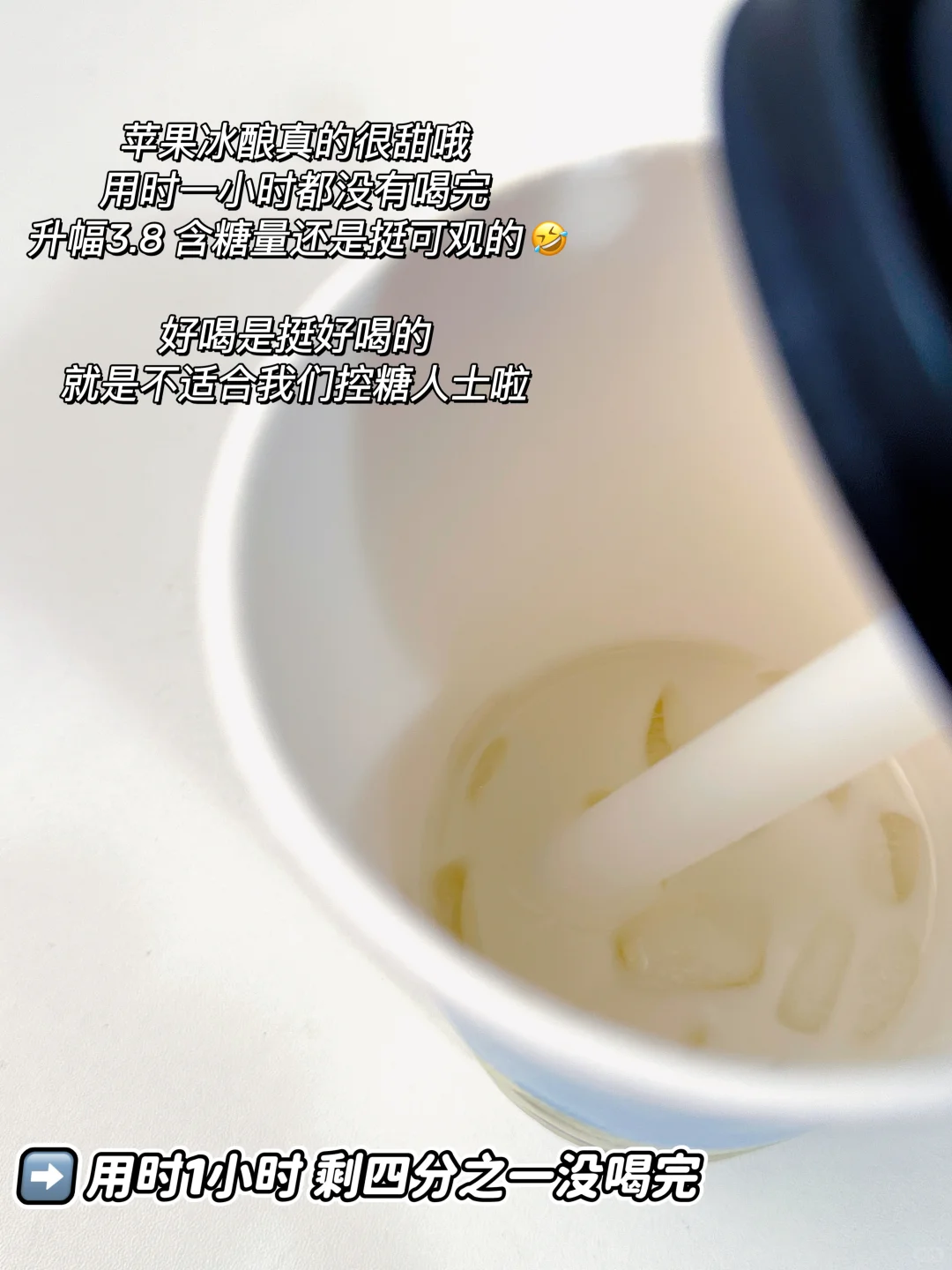 苹果冰酿真的很甜哦,用时一小时都没有喝完,升幅3.8,含糖量还是挺可观的🤣