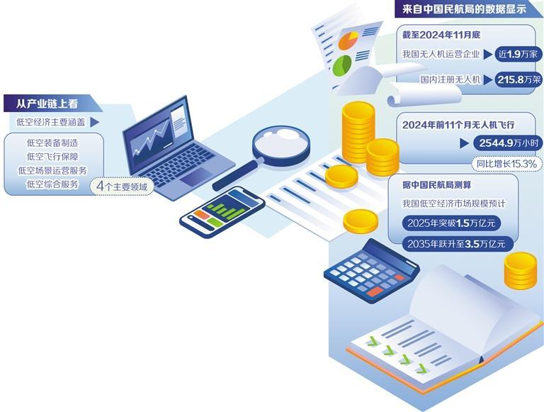 近年来,低空经济发展保持强劲增长态势。从产业链上看,低空经济主要涵盖低空装备制造、低空飞行保障、低空场景运营服务与低空综合服务4个主要领域。来自中国民航局的数据显示,截至2024年11月底,我国无人机运营企业近1.9万家,国内注册无人机215.8万架。2024年前11个月无人机飞行2544.9万小时,同比增长15.3%。据中国民航局测算,我国低空经济市场规模预计2025年突破1.5万亿元、2035年跃升至3.5万亿元。