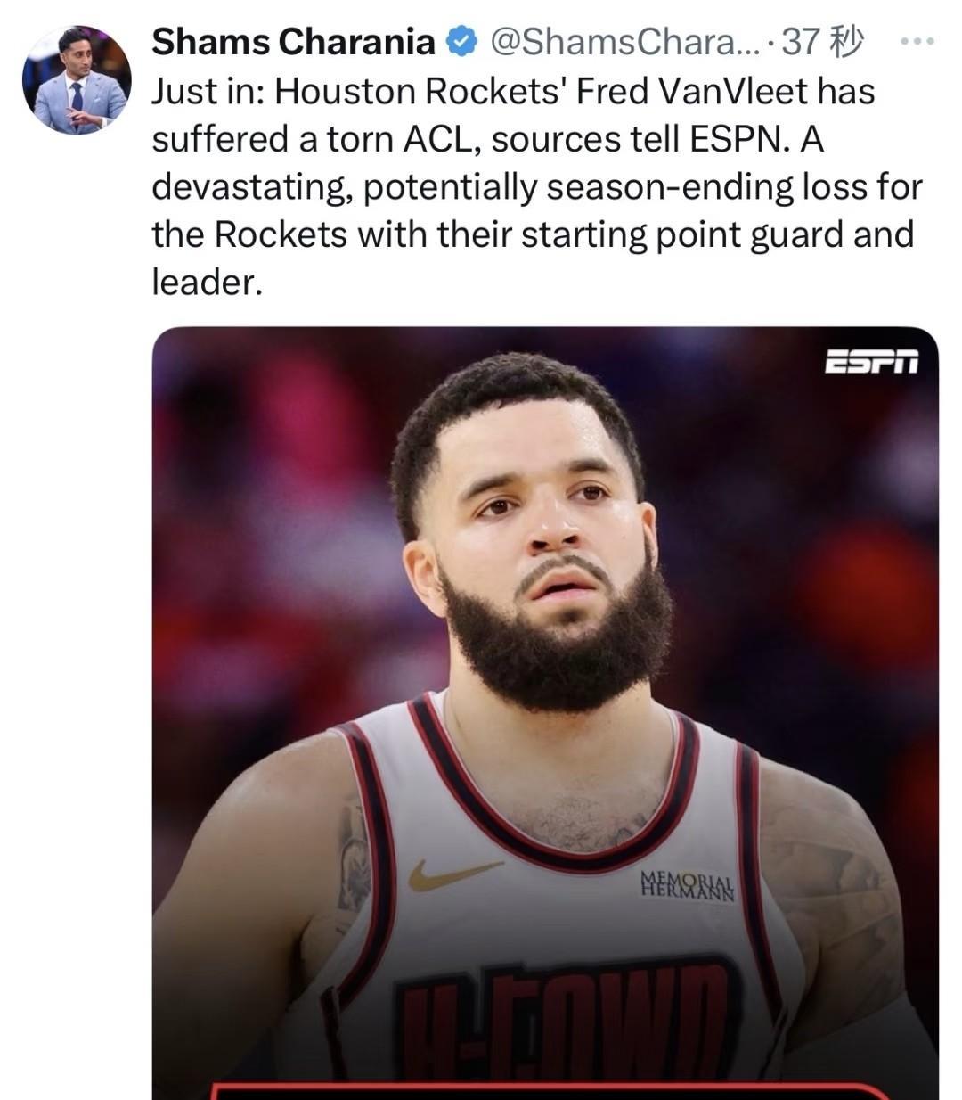 噩耗传来,休斯顿火箭未起飞已折翼。 据消息确认,休斯顿火箭队控卫弗雷德·范佛里特遭遇前交叉韧带(ACL)撕裂,预计将长期缺阵。 这对火箭而言无疑是一次沉重打击。范佛里特不仅是球队本赛季的首发控卫,更是场上的战术核心与精神领袖,他的缺阵将严重影响球队的战术体系和更衣室稳定。 今年休赛期,火箭刚以一份两年5000万美元的合同签下范佛里特,视其为重建过程中的关键一环。此次重伤无疑为球队本赛季的前景蒙上了一层阴影。