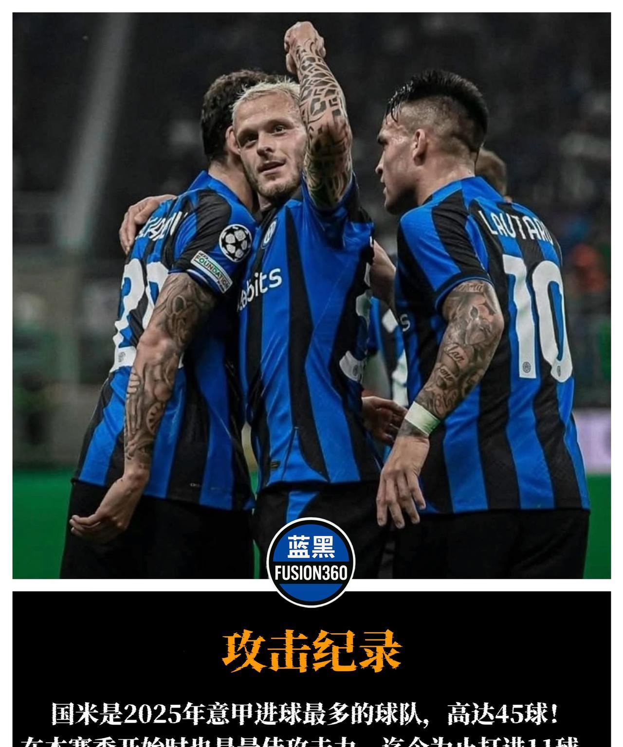 国米2025年攻击火力全开,目前45球领跑意甲但防守亮红灯 国际米兰2025年攻击表现惊艳,全年轰入45球高居意甲射手榜榜首,这样的火力在整个联赛中独一无二。 新赛季开局四轮国米延续强劲攻势 ,11个进球成为联赛最犀利攻击线 ,场均接近3球的效率令对手胆寒。 但进攻端大杀四方的同时防守却暴露短板,四场比赛丢掉7球在顶级球队中格外刺眼,整个意甲只有都灵和莱切防守更糟都失球8个。