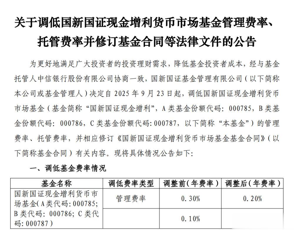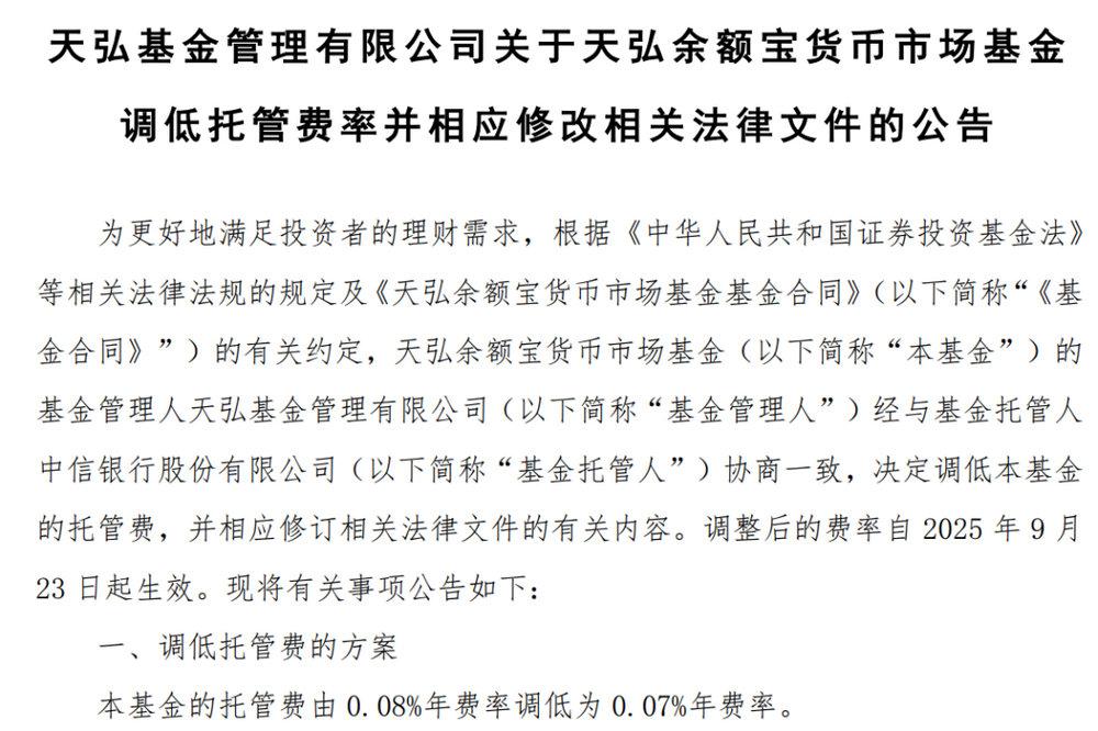 [#余额宝十年来首次降费#意味着什么?]市场规模最大货基余额宝官宣降费,货基费率改革或由此拉开帷幕。今日,天弘基金公告称,旗下天弘余额宝货币市场基金调低托管费率并相应修改相关法律文件。具体来看,天弘余额宝的托管费由0.08%年费率调低为0.07%年费率,即下降0.01%。在业内人士看来,此举或意味着货基费率改革的开始,费率的下调主要受到收益率下行和监管政策的影响。同日还有国新国证现金增利、易方达保证金也宣布调降费率,合计费率分别下降了0.13%、0.08%。(财联社)