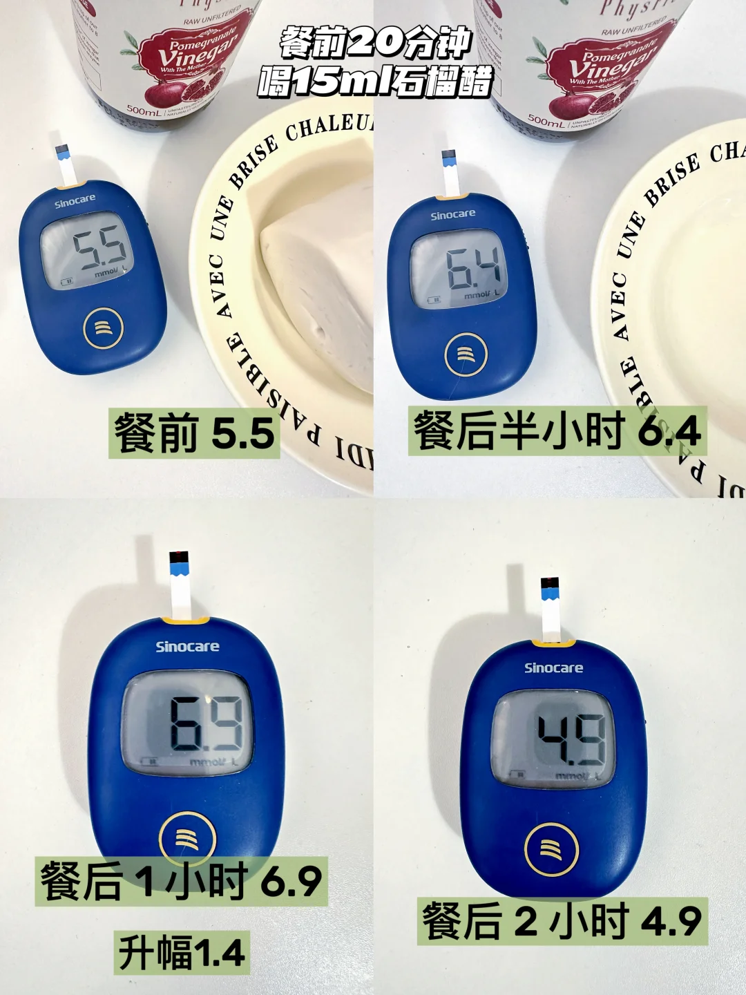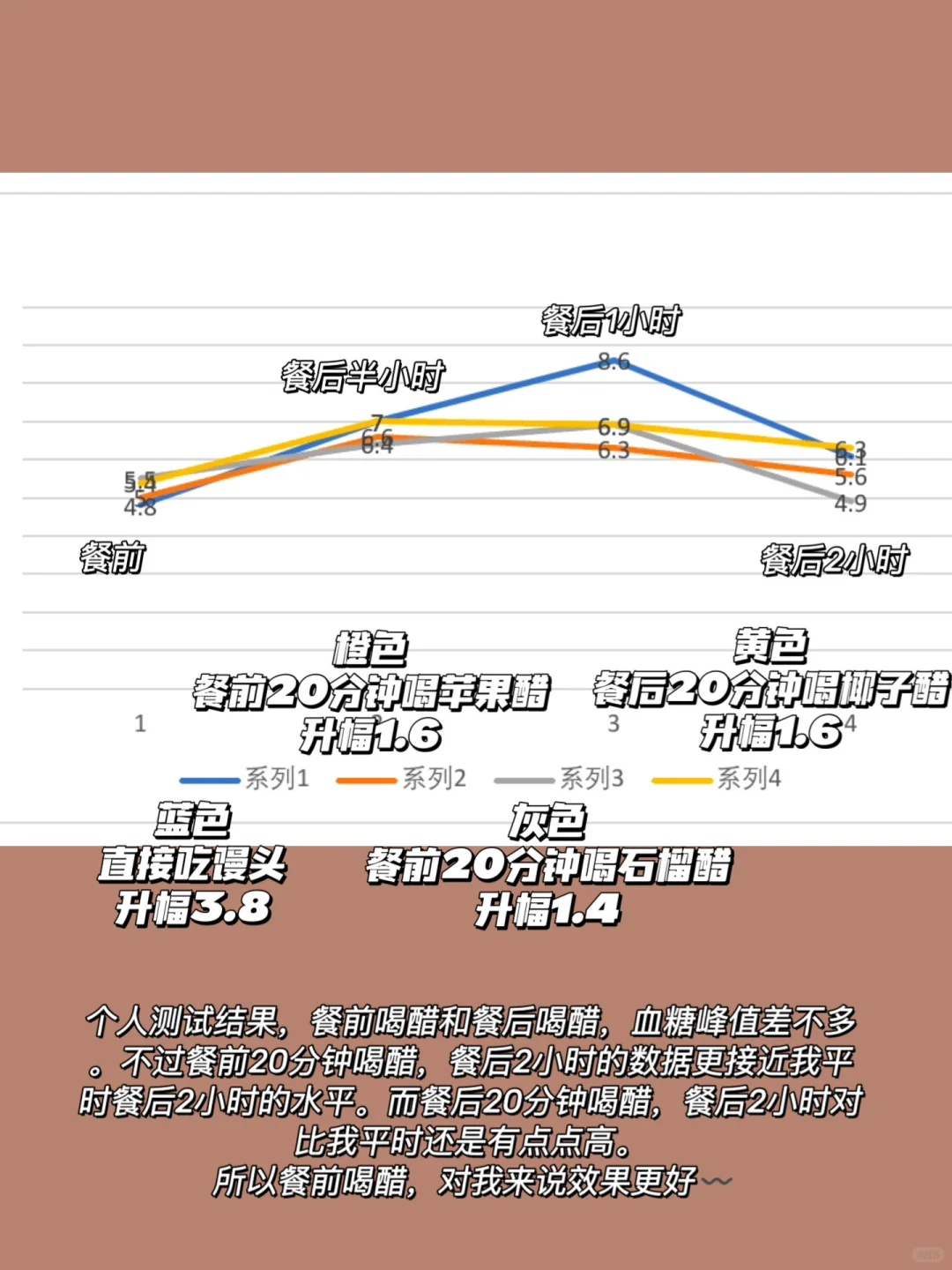 个人测试结果,餐前喝醋和餐后喝醋,餐后1小时血糖升幅都差不多,都有明显的降低效果,宝子们可以根据自己的情况,选择餐前喝或是餐后喝哦✌🏻