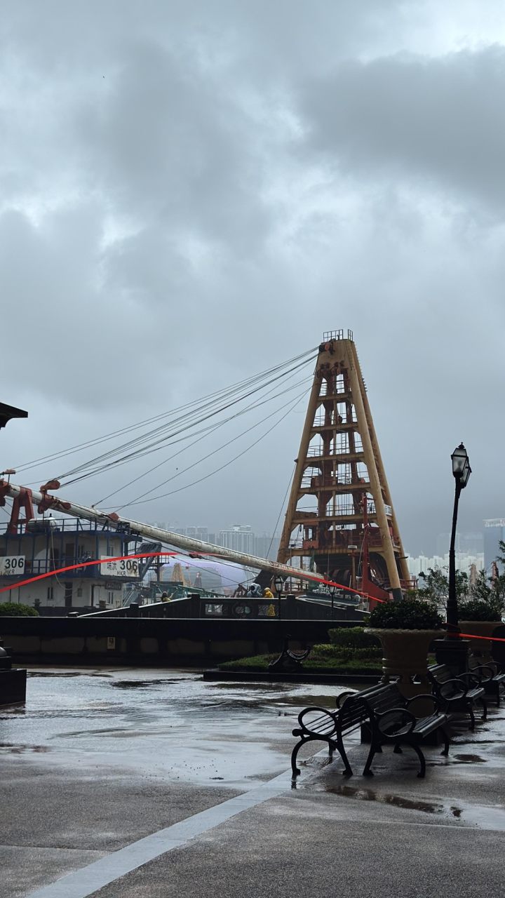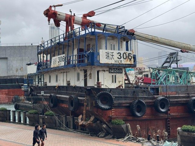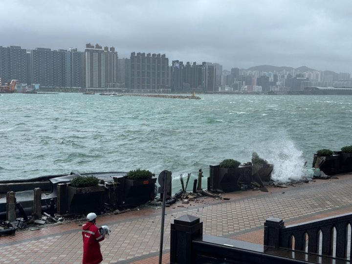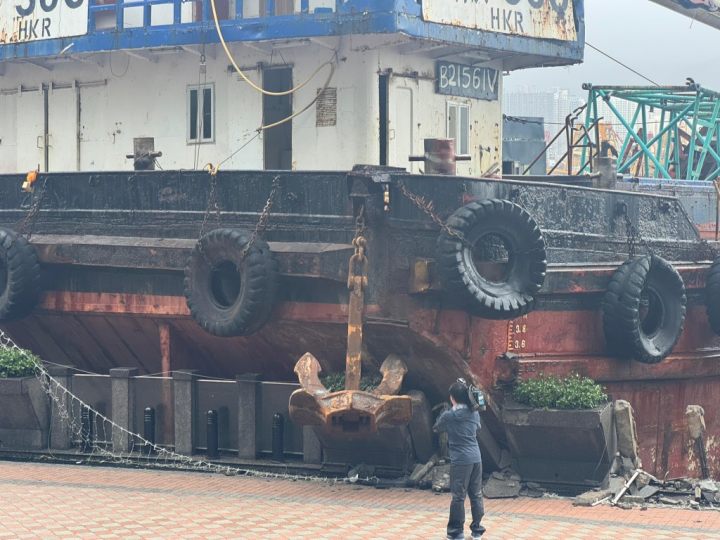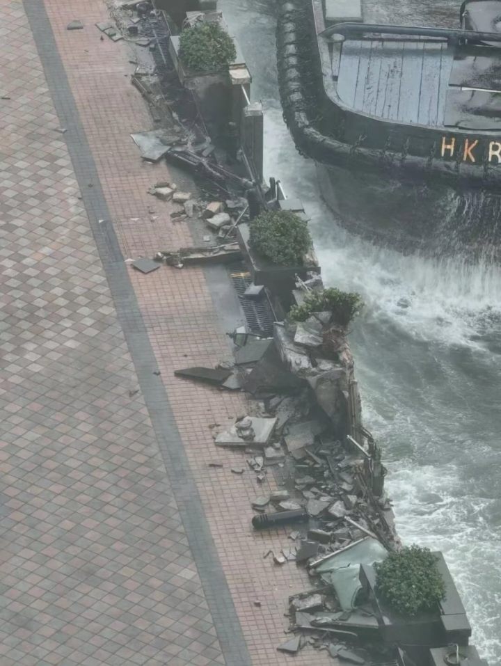 在狂风巨浪下,红磡九龙海逸君绰酒店附近海面发生惊险事故。现场可见,一艘轮船在风浪猛烈下,疑似失控撞向岸边,岸边石栏严重损毁,碎片四散波及行人道。轮船撞击后船身一度紧贴岸边,船锚甩向人行道。