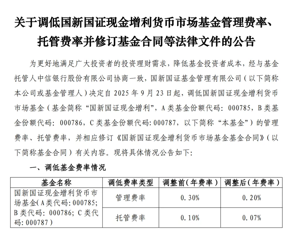 国新国证现金增利货币市场基金也公告称,9月23日起,将管理费年费率由0.30%调整为0.20%,将托管费年费率由0.10%调整为0.07%。