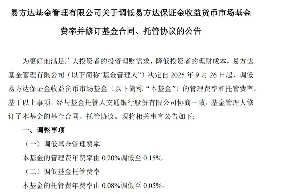 无独有偶,同日,易方达基金也公告调低易方达保证金收益货币市场基金的费率,管理费年费率由0.20%调低至0.15%,托管费年费率由0.08%调低至0.05%,调整自9月26日生效。