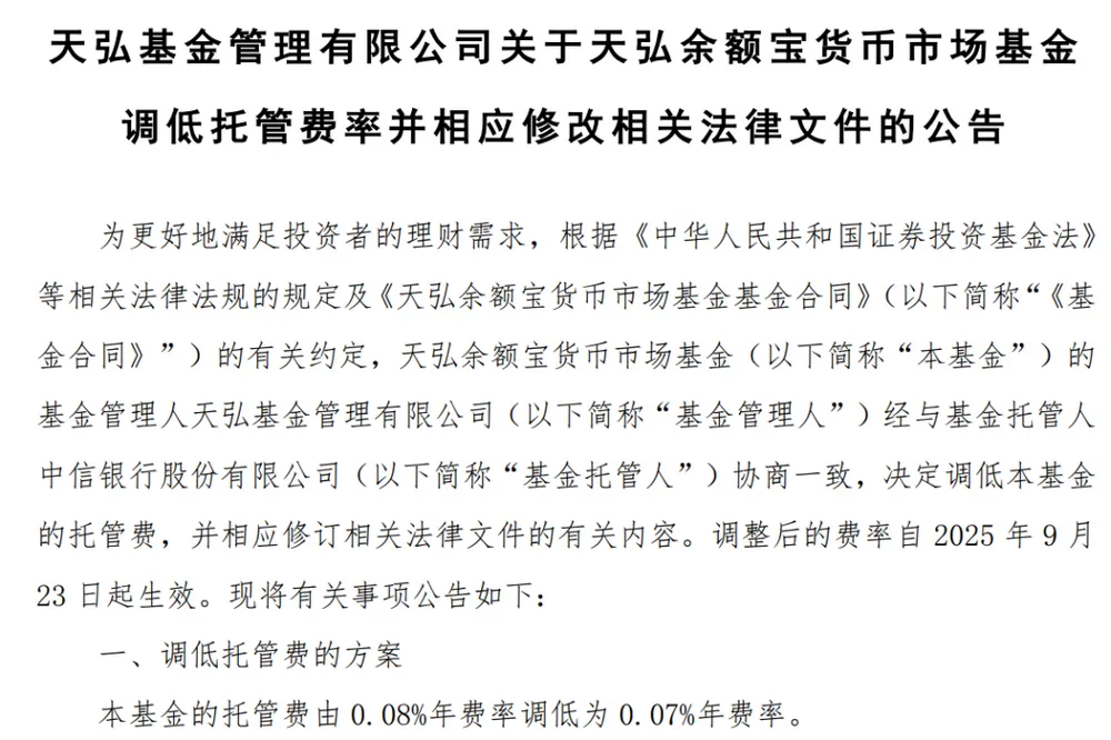 9月23日,天弘基金公告表示,天弘余额宝货币市场基金托管费将由0.08%年费率调低至0.07%年费率,自9月23日起生效。