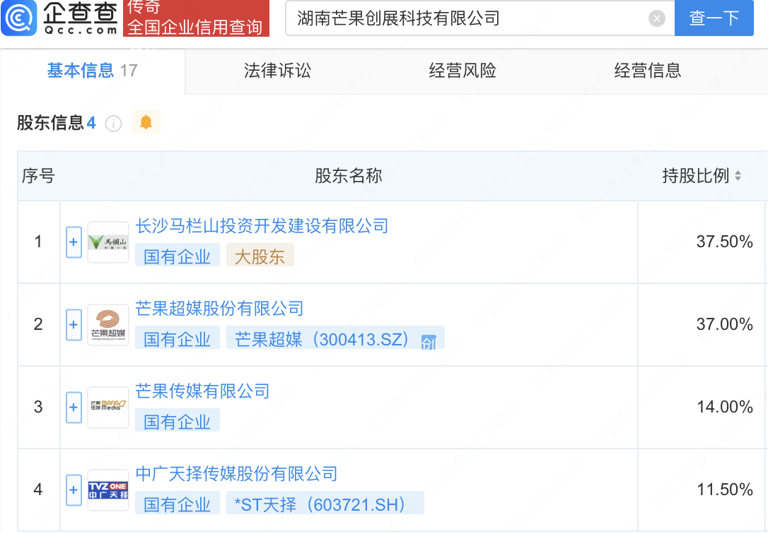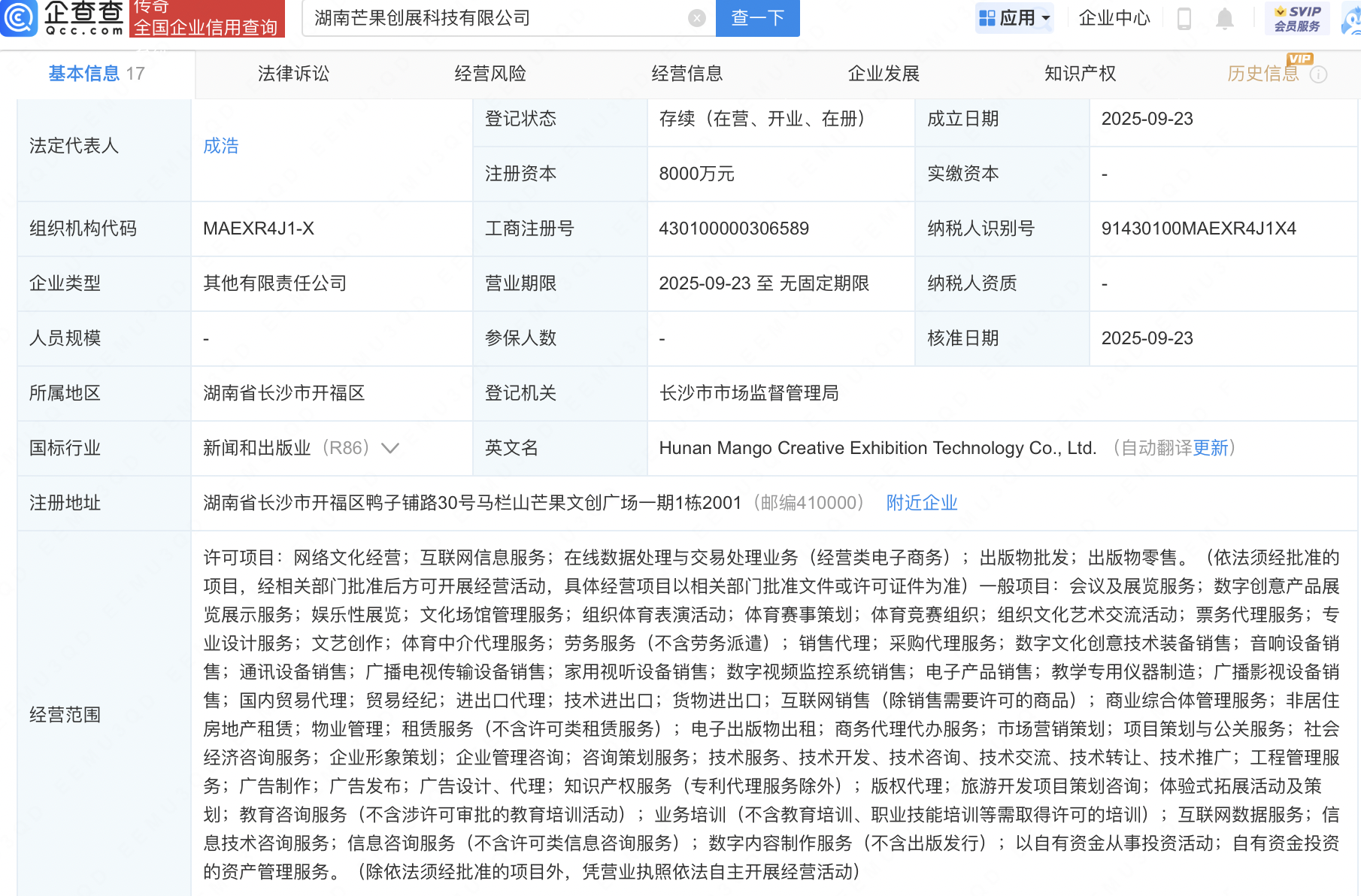 企查查APP显示,近日,湖南芒果创展科技有限公司成立,注册资本8000万元,经营范围包含:网络文化经营;互联网信息服务;数字文化创意技术装备销售;广播电视传输设备销售等。企查查股权穿透显示,该公司由芒果超媒(300413)、*ST天择(603721)等共同持股。