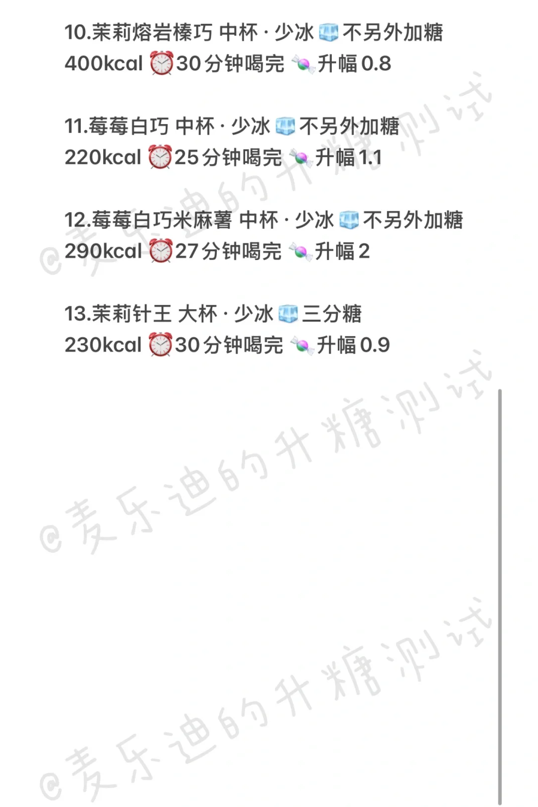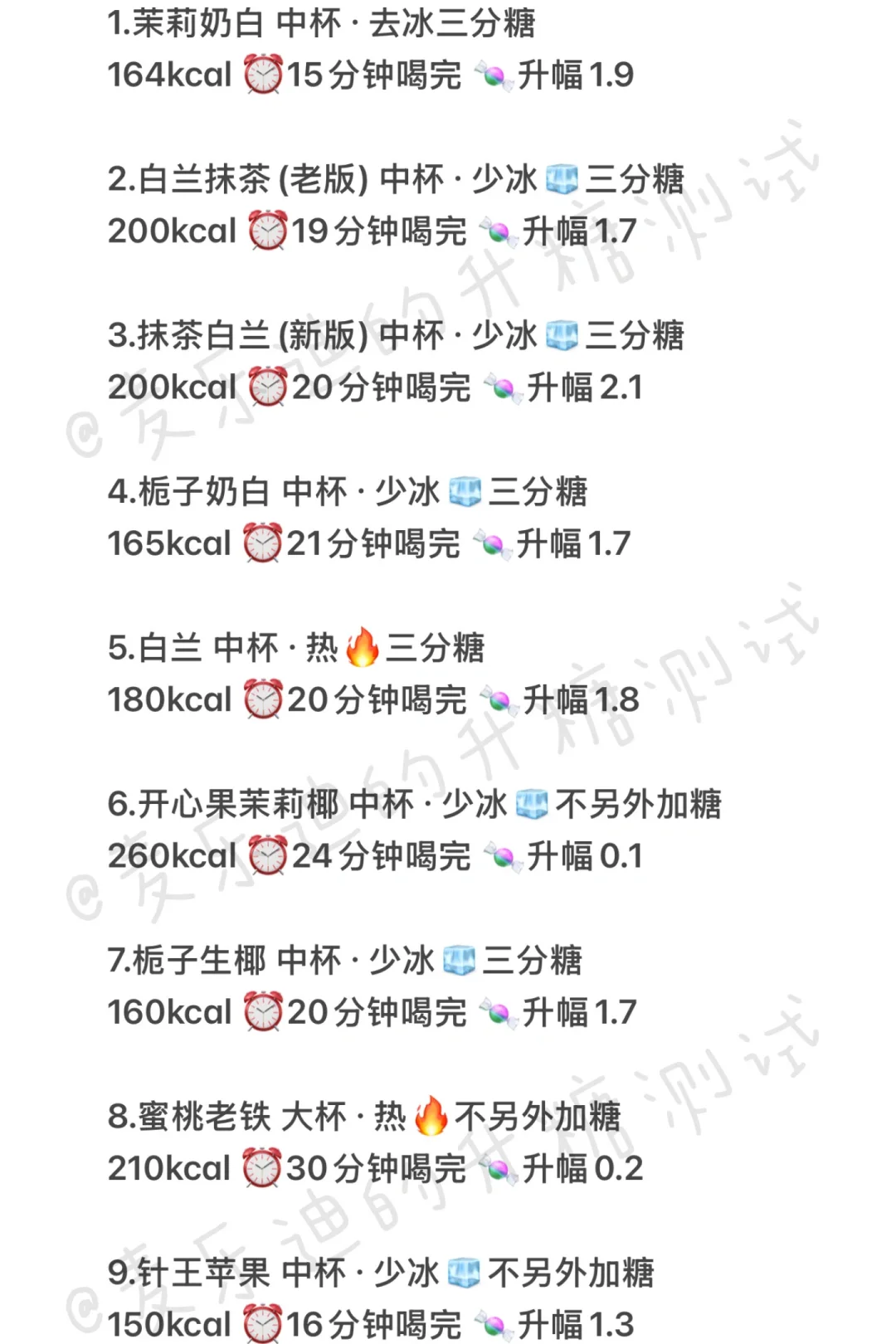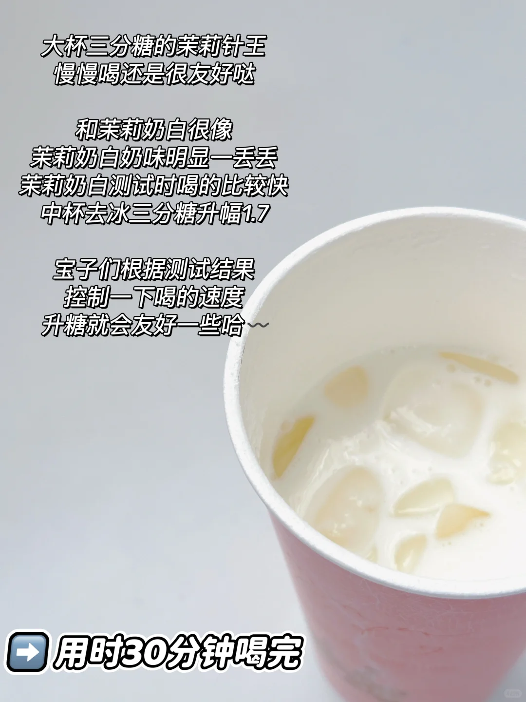 茉莉奶白测试时喝的比较快,中杯去冰三分糖升幅1.7,宝子们根据测试结果,控制一下喝的速度,升糖就会友好一些哈〰️