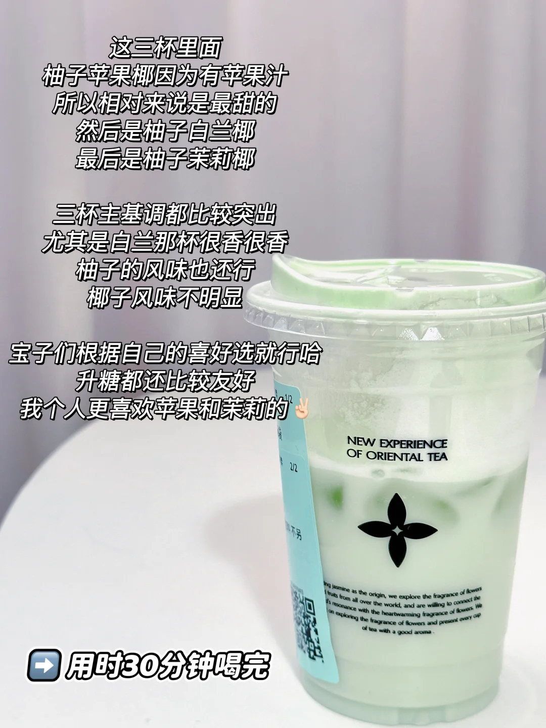 这三杯里面,柚子苹果椰因为有苹果汁,所以相对来说是最甜的,然后是柚子白兰椰,最后是柚子茉莉椰〰️