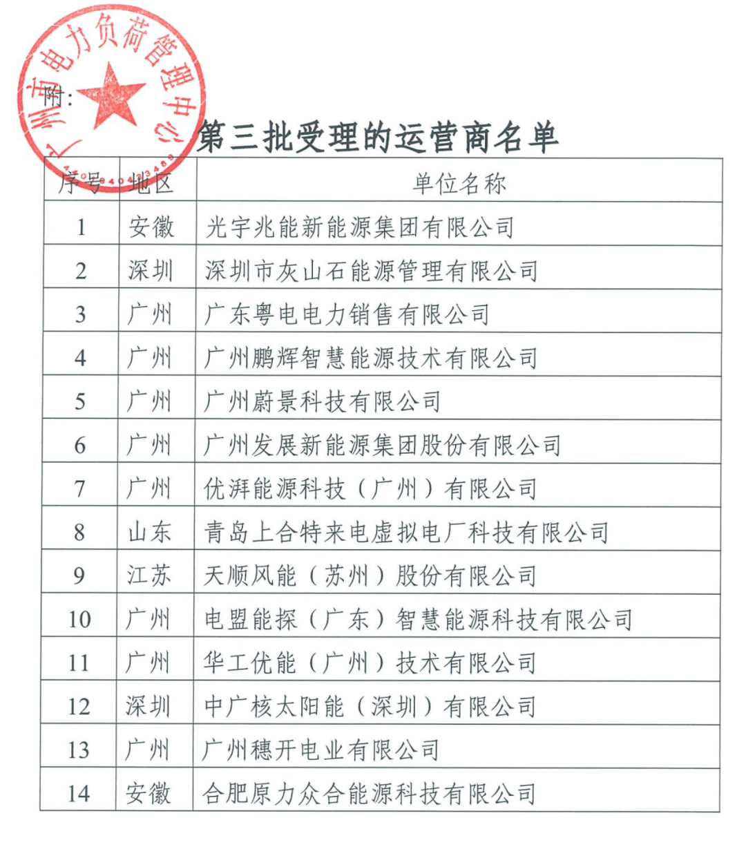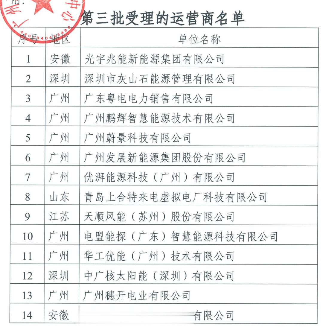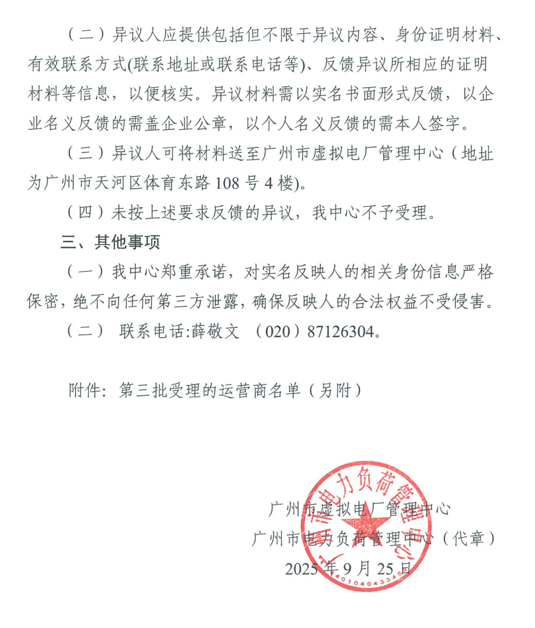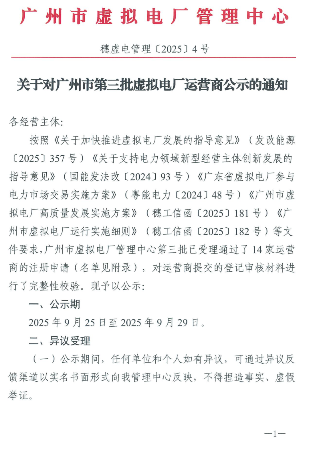 储能与电力市场获悉,近日,广州市虚拟电厂管理中心发布《关于对广州市第三批虚拟电厂运营商公示的通知》,第三批共计14家运营商的注册申请被受理,公示期2025年9月25日至2025年9月29日。