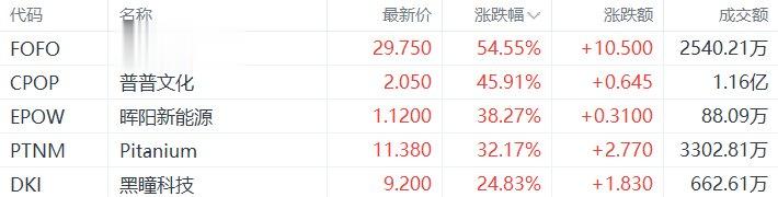 美股异动丨恒峰科技创新涨54.55%,为涨幅最大的中概股