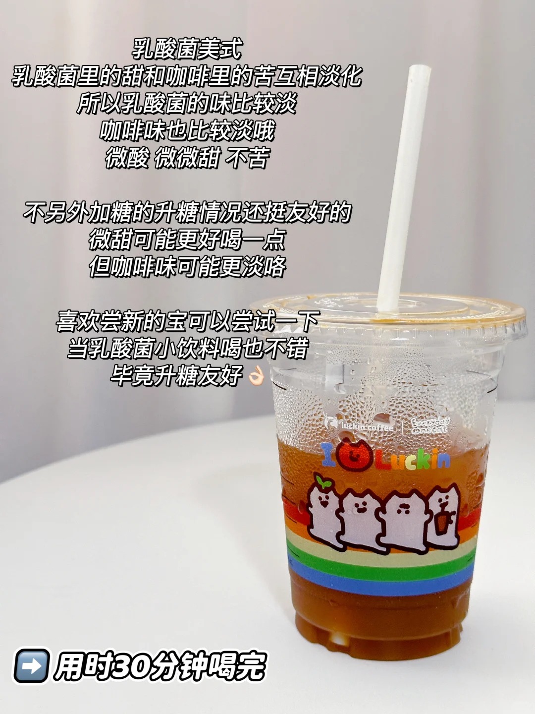 乳酸菌冰茶的乳酸菌味还挺足的,比乳酸菌美式甜🍬甜度足够,不用再增加甜度👌🏻不过茶味也是不明显的,约等于一杯口感顺滑的乳酸菌饮料[暗中观察R]