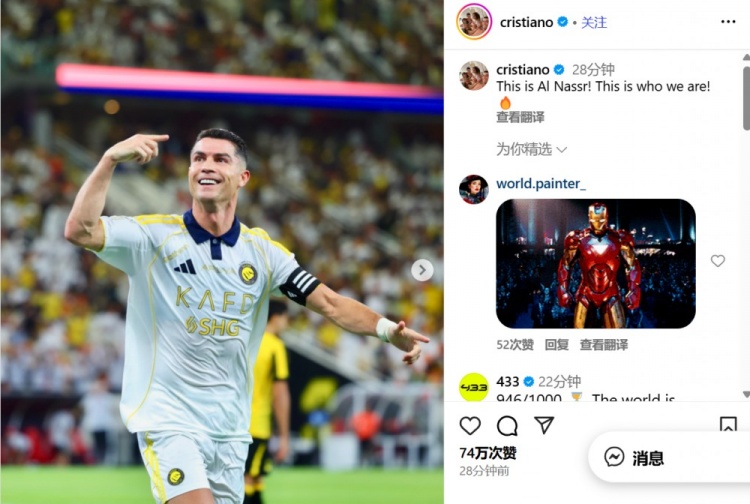 C罗晒出了自己的赛场照,并写道:“这是利雅得胜利!这就是我们的风格!”