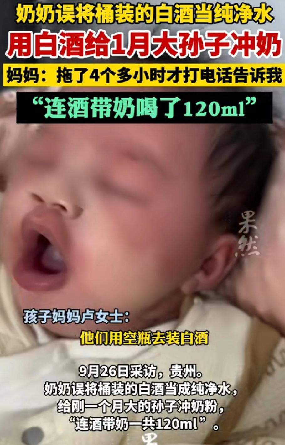 #贵州老人用白酒冲奶给孙子喝# 奇葩!心疼!气愤!泪目!奶奶误将白酒当成饮用水给冲奶,一共喝了120毫升,大约相当于用了2两酒呢!一个月零40天的婴儿竟然遭次横祸!中午12点就已经有反应!但是奶奶下午4点才告诉孩子的妈妈卢女士!孩子妈妈回来以后发现孩子全身通红!紧急送医! 婴儿妈妈回复说,奶奶是个特别粗心的人,根本闻不出来! 所以是闻不出来,还是根本没闻呢? 除了味道的问题,另一个就是温度的问题,酒是凉的,难道奶奶不知道冲奶粉要用度40度到60度的水吗?难道手感觉不到温度吗?还是一直在用凉水给孩子冲奶粉呢? 原来是奶奶把酒倒进恒温壶,她家是用恒温壶来给水定温。一个月大的宝宝竟然喝的是带温度的酒!那酒在加热的时候,味道会散发的更加浓郁。 另一个令大家吃惊的问题就是孩子12点就已经起了反应,为什么4点才通知孩子的妈妈?婆媳有矛盾吗? 大家最担心孩子的身体状况,担心白酒对孩子的脑细胞产生不良影响,将来会影响孩子智力和记忆力吗?喝的可是120ml带奶的酒啊。 网友们看到这个事情之后纷纷吐槽自己孩子的奶奶! 比如说自己婆婆给孩子刷的奶瓶永远都没有刷干净过,里边儿都已经滋生细菌了!告诉孩子奶奶千百遍,但是她永远用100度的水给孩子冲奶粉! 不过值得庆幸的是孩子现在已经9个月大了,目前情况一切良好!妈妈说再大点带孩子再去做大检查! 也许这个孩子的妈妈只是大概的说了一下事情,我们并没有了解事情的全部真相! 总之,家里别再用矿泉水瓶装其他的东西了,以免有人饮!即便装的话,贴上标签,离老人和孩子远点! 另外一点孩子奶奶没有及时联系妈妈,可能会以为没有多大影响或者是害怕孩子妈妈的责备!或者两人有矛盾!目前说是已经不让奶奶单独看小孩了! 遇到这样的事,脾气急的妈妈肯定就闹起来了,这位妈妈卢女士,算是比较理智的!