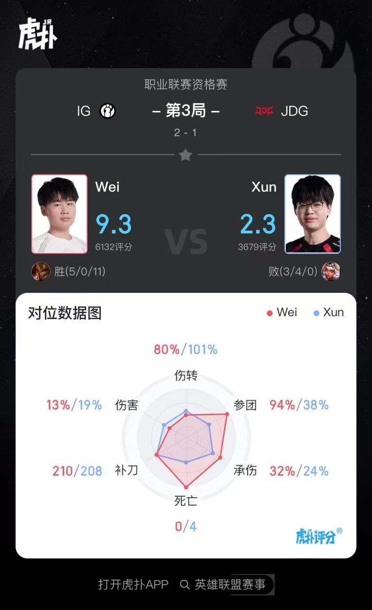 虎扑09月27日讯在刚刚结束的IG对阵JDG的BO5比赛中,Wei使用皇子打出5/0/11战绩,斩获IG对阵JDG第三局MVP