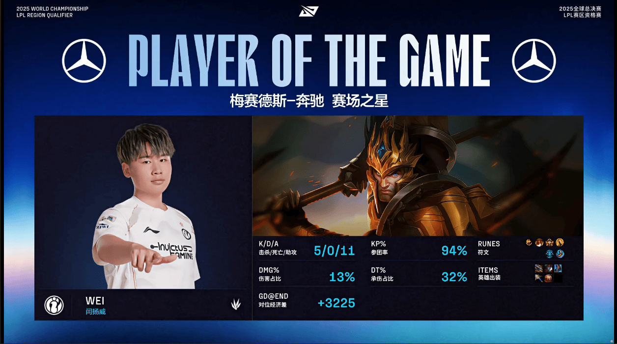 Wei使用皇子打出5/0/11战绩,斩获IG对阵JDG第三局MVP
