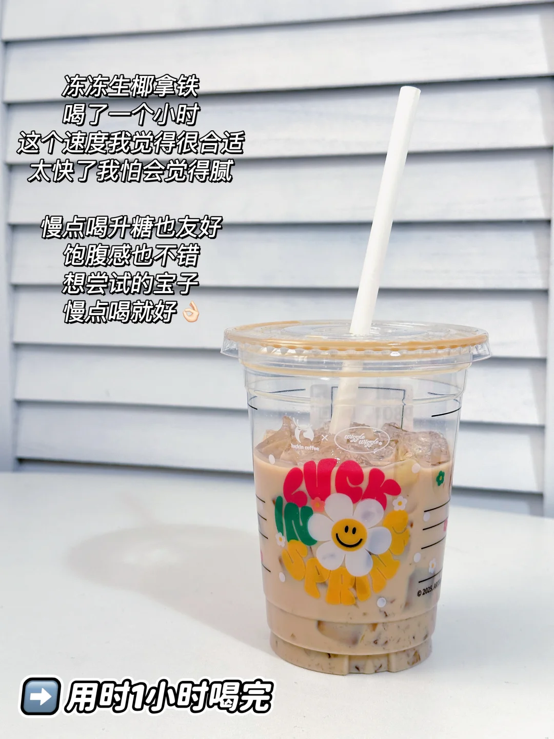 冻冻生椰拿铁,喝了一个小时,这个速度我觉得很合适,太快了我怕会觉得腻,慢点喝升糖也友好〰️