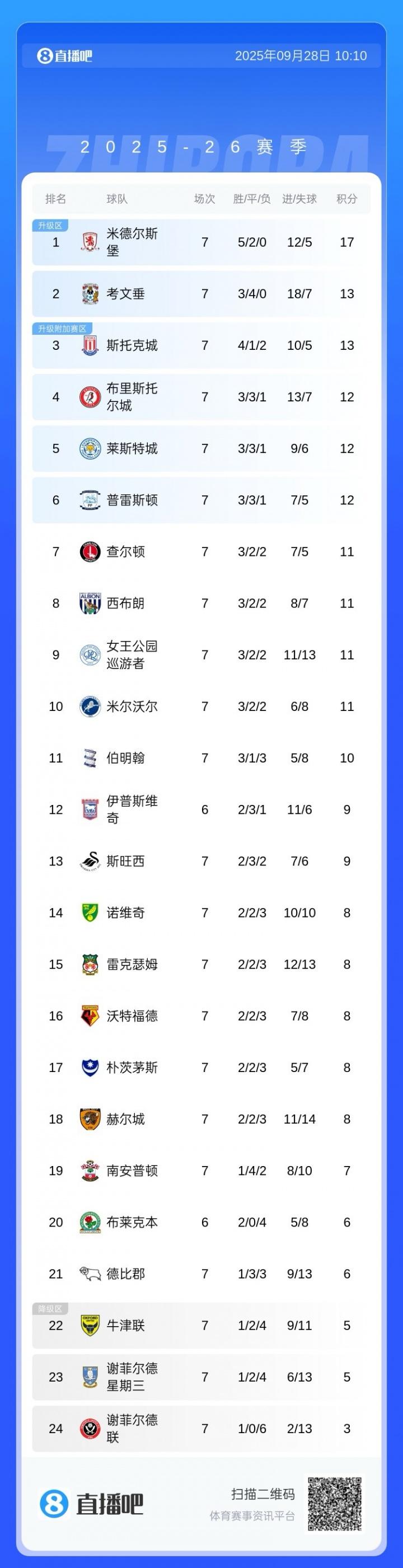 直播吧09月28日讯英冠昨日第七轮比赛全部结束。