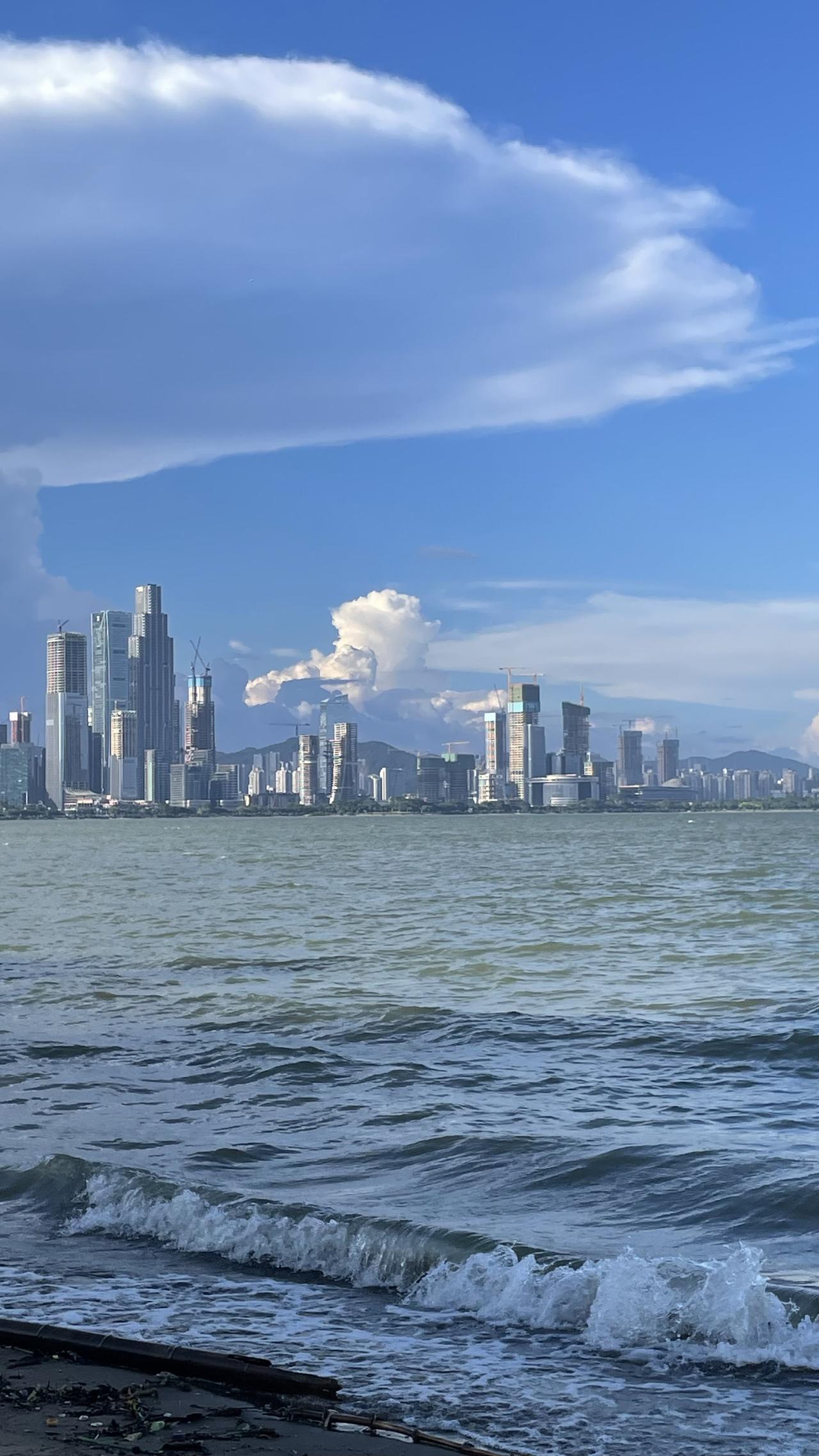 周末被骗过来看海 深圳湾公园 一开始看网上说有沙滩 小孩子专门带了铲子、沙桶 停车很紧张,根据导航显示7号停车场车位充裕 到了才发现停车场需要提前预约 只能随大流跟着停路边 心里一直担心被帽子叔叔抄牌 这里适合骑行,但我却领着沙桶、铲子带着2孩子沿着滨海绿道走啊走 最后在一片很小岸边找到一块沙滩 不适合玩水,都是从海边冲上来的垃圾 对面的香港城市高楼林立 但已经不会像改革开放之前那样让人向往 深圳的发展已经让对面的香港人开始向往 [呲牙][呲牙][呲牙] 记录我的2025随手拍下一张天空照 深圳湾公园 深圳港湾看海