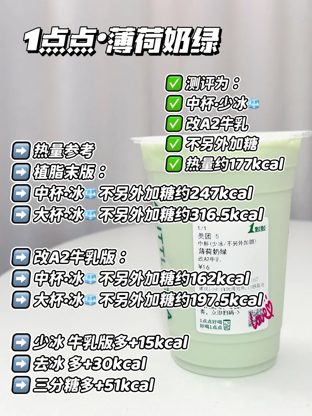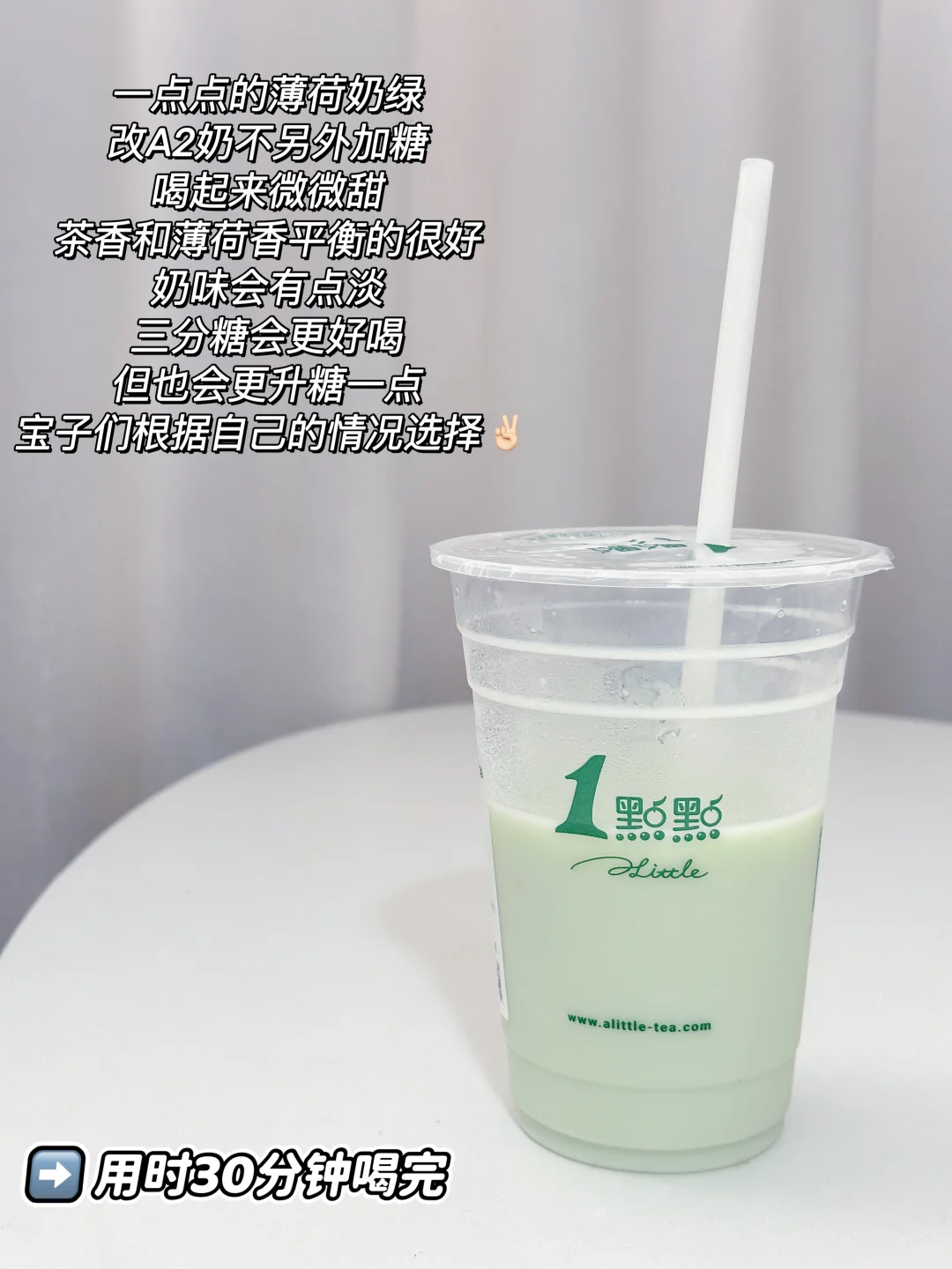 一点点的薄荷奶绿改A2奶不另外加糖,喝起来微微甜,茶香和薄荷香平衡的很好,奶味会有点淡,三分糖会更好喝。但也会更升糖一点,宝子们根据自己的情况选择✌🏻