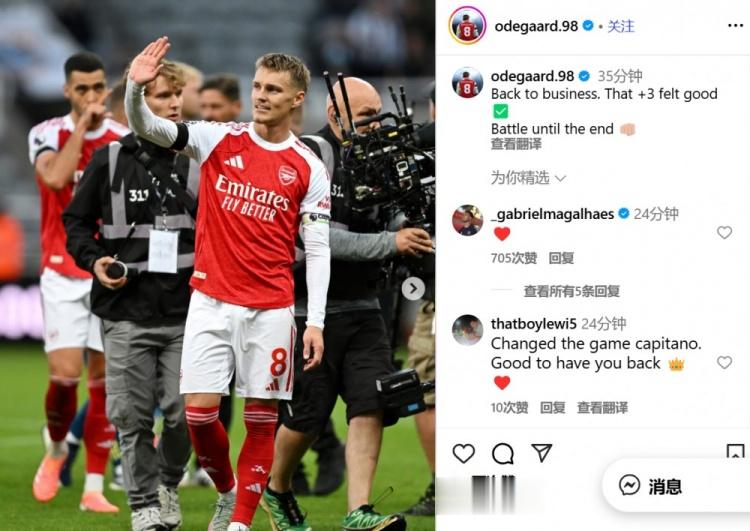 直播吧9月29日讯阿森纳在本轮英超2-1绝杀逆转纽卡,赛后,厄德高更新了社交媒体。