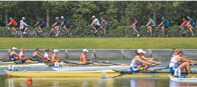 硬件设施是办赛的底气,覆盖赛场调度与日常服务的赛事组织则处处体现着赛事的温度。选手比赛时,教练需沿着航道动态跟踪队员的比赛进程,组委会贴心配备自行车,精准解决这一现场需求。