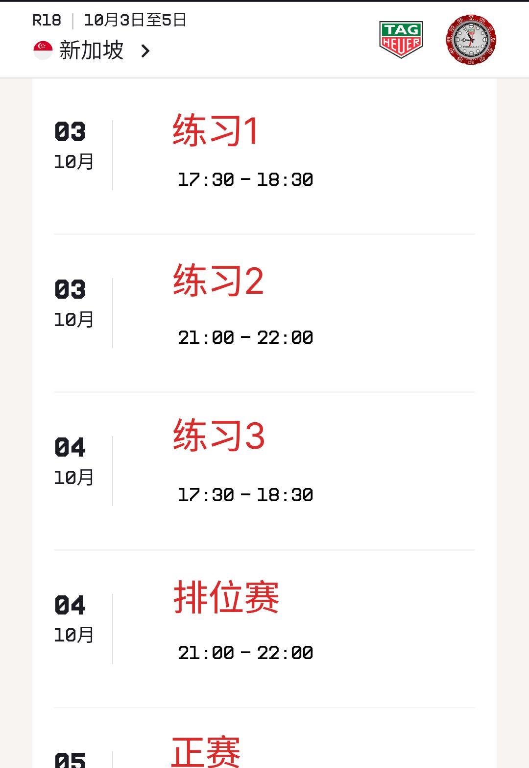 2025F1(第18站)新加坡大奖赛 比赛时间(北京时间): 10月3日(周五): 一练 17:30 - 18:30 二练 21:00 - 22:00 10月4日(周六) 三练 17:30 - 18:30 排位赛 21:00 - 22:00 10月5日(周日) 正赛 20:00 赛道信息: 赛道名称:滨海湾街赛道 首次办赛:2008年 单圈长度:4.94公里 比赛距离:62圈,306.143公里 DRS区域:4个 弯角数量:19个(7右,12左) 圈速纪录:1:34.486里卡多(2024) #F1新加坡大奖赛#