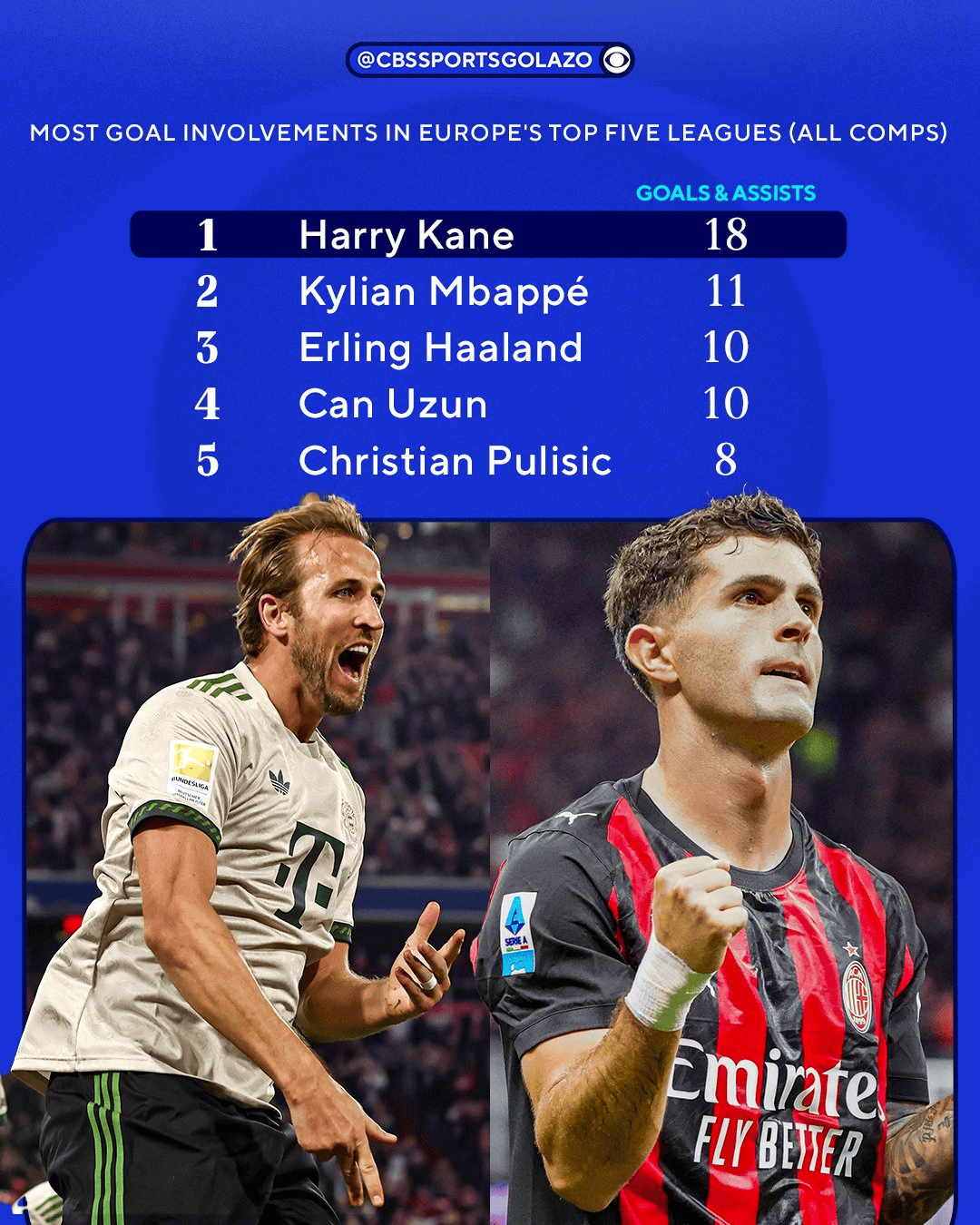 凯恩在本周末的比赛结束后继续遥遥领先,普利西奇则在对阵那不勒斯传射建功后上升到了第五位。