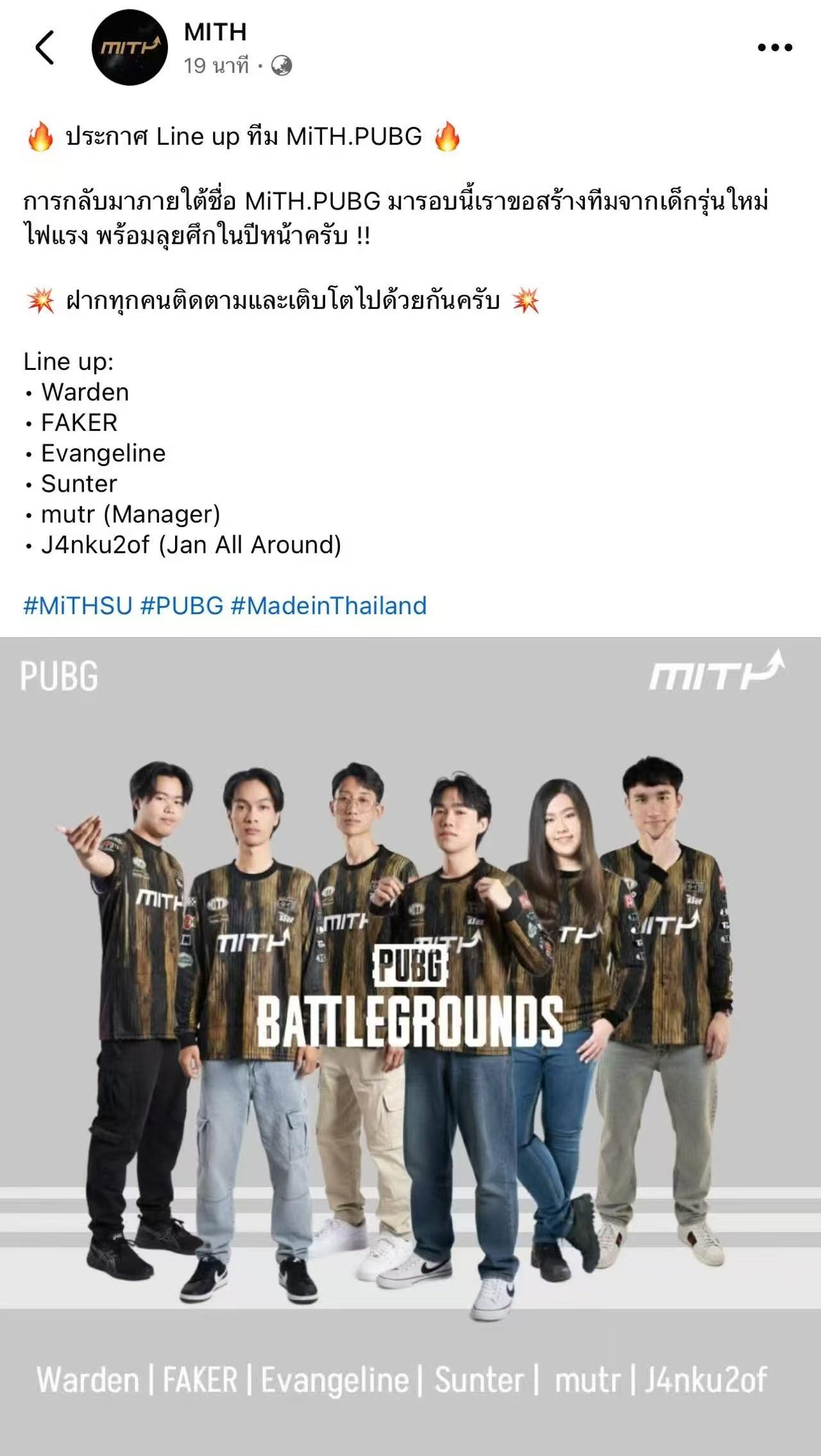 虎扑09月29日讯泰国豪门Mith社媒官宣:2026PUBG阵容
