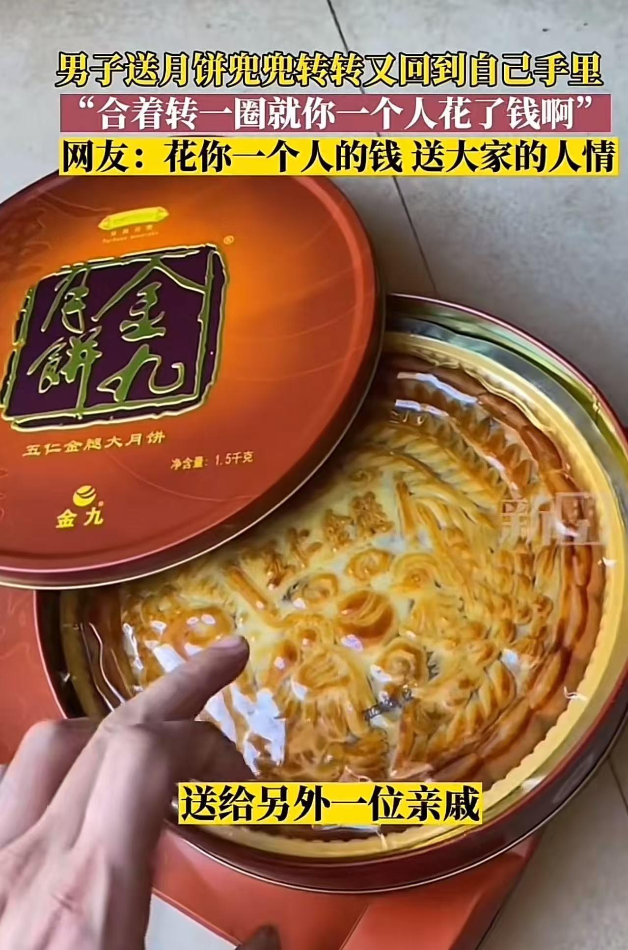 笑不活了!男子送亲戚月饼,结果兜兜转转又回到自己手里!男子:合着转一圈就我一个人花了钱啊?网友:GDP就是这样创造的!花你一个人的钱,送大家的人情!如果送的快,刚好7天无理由,你退货给商家。大家都送了礼,一分没花! 中秋佳节即将来临,男子精心挑选了一盒月饼,送给了亲戚。 几天之后,男子也收到一位朋友送来的月饼。当他目光扫过包装盒的瞬间,整个人愣住了! 这包装盒看着竟和自己之前送出去的那盒月饼一模一样!男子心里犯起了嘀咕,该不会这盒月饼就是自己当初送亲戚的那盒吧? 于是男子仔细查看包装,发现还真的就是自己送出的那盒! 原来,男子买这盒月饼的时候,一个不小心把月饼盒给磕到了,磕碰的位置他记得清清楚楚,此刻眼前这盒月饼上,赫然有着同样的磕碰痕迹,位置分毫不差。 经过一番仔细询问和了解,男子终于弄清楚了这盒月饼的“奇幻旅程”。 他先把月饼送给了一位亲戚,这位亲戚可能觉得这月饼不错,又转手拿着这个月饼去拜访了另外一位亲戚。 而另外这位亲戚呢,同样没有把月饼留下自用,而是继续传递这份“情谊”,把它送给了男子的朋友。最后,男子的朋友又把这盒月饼交回到了男子的手上。 好家伙,这一圈转下来,就只有男子一个人实实在在地花了钱! 此事引发了热议,有网友说,这就叫流通,人民 币也一样!如果可以7天无理由退货,下次买了送一圈,等走了流程,在拿去退了,既搞定人情往来,又不用花钱! 也有网友说,从你的手上送出,几经周折,最终又回到你手上,正好印证了咱们的中秋节确实是“团团圆圆”。 还有网友说,事实证明月饼很不受欢迎!重糖重油能接受的人群不多!应景应季走亲访友!一人花钱解决四家问题挺好的。 现在中国有一种独有的经济模式——月饼经济,生产厂家没生产一块月饼,只是印刷一批面值100元/张的月饼劵。按批发价80元/张,批发给月饼销售商。 销售商按90元/张,销售给需要送礼的人,买月饼劵的人把月饼劵作为礼物送给亲朋好友,最后厂家按50元/张,把市场上的月饼劵收回,厂家没生产一块月饼,每张月饼劵挣30元,如果厂家印刷月饼劵10万张,就可收入300万元,神奇否? 这看似滑稽的月饼流转,实则折射出当下人情往来中一种令人无奈的现象。人们在节日里互赠礼物,本应是传递真心与关怀,可如今却渐渐变了味,成了形式主义的“循环游戏”。 大家似乎更在意礼物的表面往来,而忽略了其中蕴含的真情实意。如此这般,节日的温馨与感动都被消磨殆尽,只剩下空洞的形式和无尽的疲惫。这样的“人情循环”,究竟是拉近了彼此的距离,还是让心灵变得更加疏远了呢?