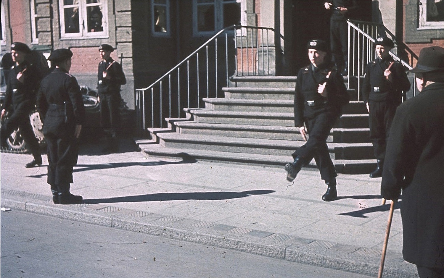 1940 年 4 月,丹麦霍森斯市约根森酒店附近第 40 坦克营的士兵。