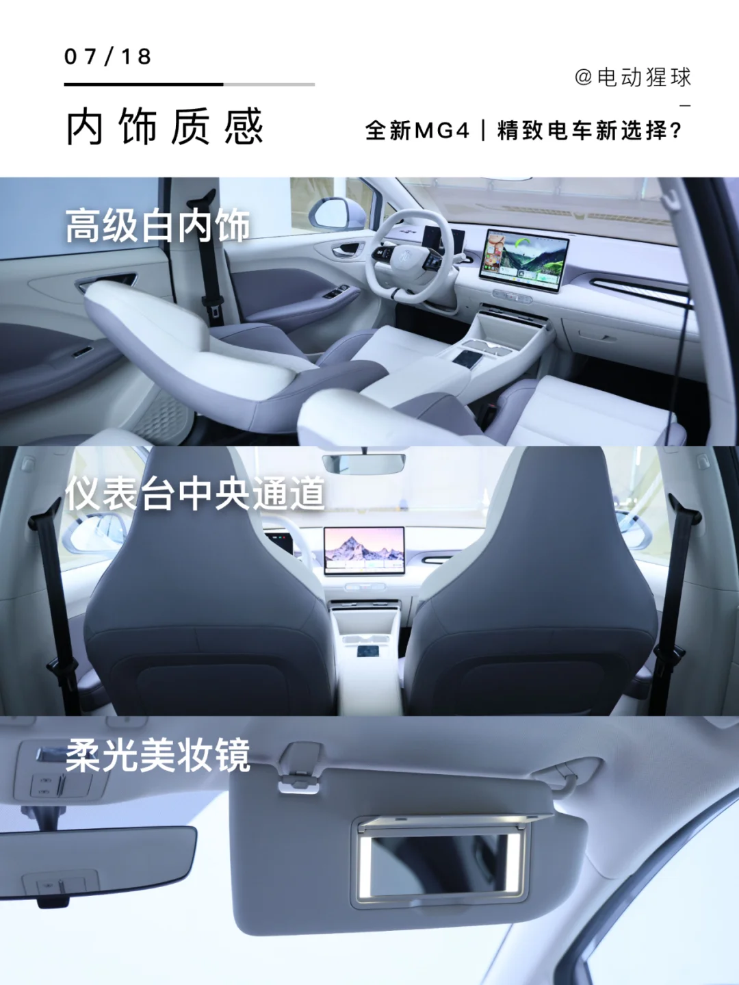 2️⃣内饰才是重头戏,堆料很足,这是下血本了,把 20万级的配置都塞进来了。什么双层镀银防晒玻璃、全车戴森同款静音电机、100% 母婴级软包,带风冷的 50W 超快充、座椅➕椅背通风等等MG4这次通通都有。不光如此,还有对女生友好的双侧柔光美妆镜,随时补妆不刺眼。