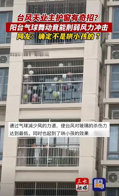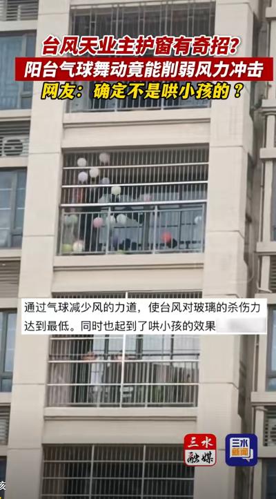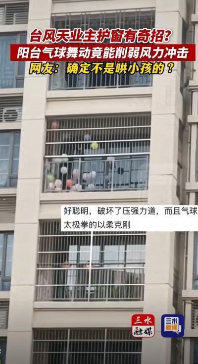 “太有头脑了!”广东佛山,男子为了应对台风桦加沙,竟然一次性打了10多个气球,将它们全部放在阳台上,台风登陆之后,外面狂风大作,阳台的气球吹得到处飞舞,一开始邻居还以为男子是为了好玩,可是,网友看到后,却认为男子太聪明了! 在人们知道了“桦加沙”台风的消息之后,很多居民为了以防万一都开始清空自己的阳台,然后还在玻璃上面做了很多防范措施。 然而小唐(化名)不仅没有做任何的防范措施,反而还弄了一些气球放系到了阳台的围栏上面,风吹过的时候气球在阳台上翻翻起舞,在整栋格外的显眼。 邻居们看到之后物业群直接就炸了锅,很多人在里面说小唐这一行为也太随意了吧,甚至还有邻居觉得这件事情很有意思,接直接将这个视频发到了网上,不料瞬引起了网友的热评。 一些网友在下面评论调侃说:应该在气球上面给弄一个抹布,这样的话在气球滚动的时候连带着就把玻璃也擦干净了一举两得。 但也有一些懂行的人在下面留言说,这不仅是看起来好玩,里面还蕴含着很深的学问。气球的存在可以帮忙干扰强风的,风本来是直直打到玻璃上,容易造成损坏。 但气球随风乱动,不断摇摆、碰撞,会让气流变得不稳定,把部分力量消耗掉。等风真正到达窗户时,已经弱了不少。 小唐选用的是乳胶气球,更为柔软且富有弹性。那么如果使用邦邦的塑料气球,就不可能出现这样的情况。由此看来这他并不是随意一试,而是经过思考后才这样做的。 看到这之后邻居们才明白,这看似奇怪的做法,其实很聪明。虽然没有向他们那样在玻璃上贴东西,却一样能够起到防护的作用。 还有人补充,这招除了能减轻风力冲击,对家里的孩子也有用,小孩在台风天常常害怕,但看到窗外五颜六色的气球随风摆动,会觉得有趣,紧张感也能缓解一些,相当于多了一层心理安慰。 它不仅解决了现实问题,也让人反思我们平时的思维习惯,遇到困难是不是太依赖“硬抗”。 最后通过这件事情也告诉我们面对问题的时候只要换个思路,就能解决实际问题。 (信息来源 :据三水新闻 2025-09-26)