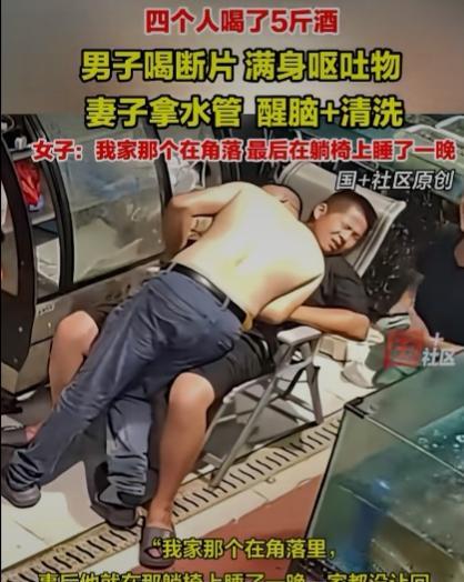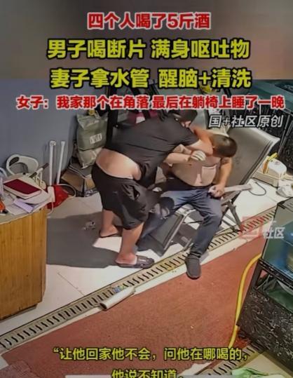 四个大男人喝了5斤白酒,男子喝断片,全身都是呕吐物,妻子无奈用水管冲洗另外加给男